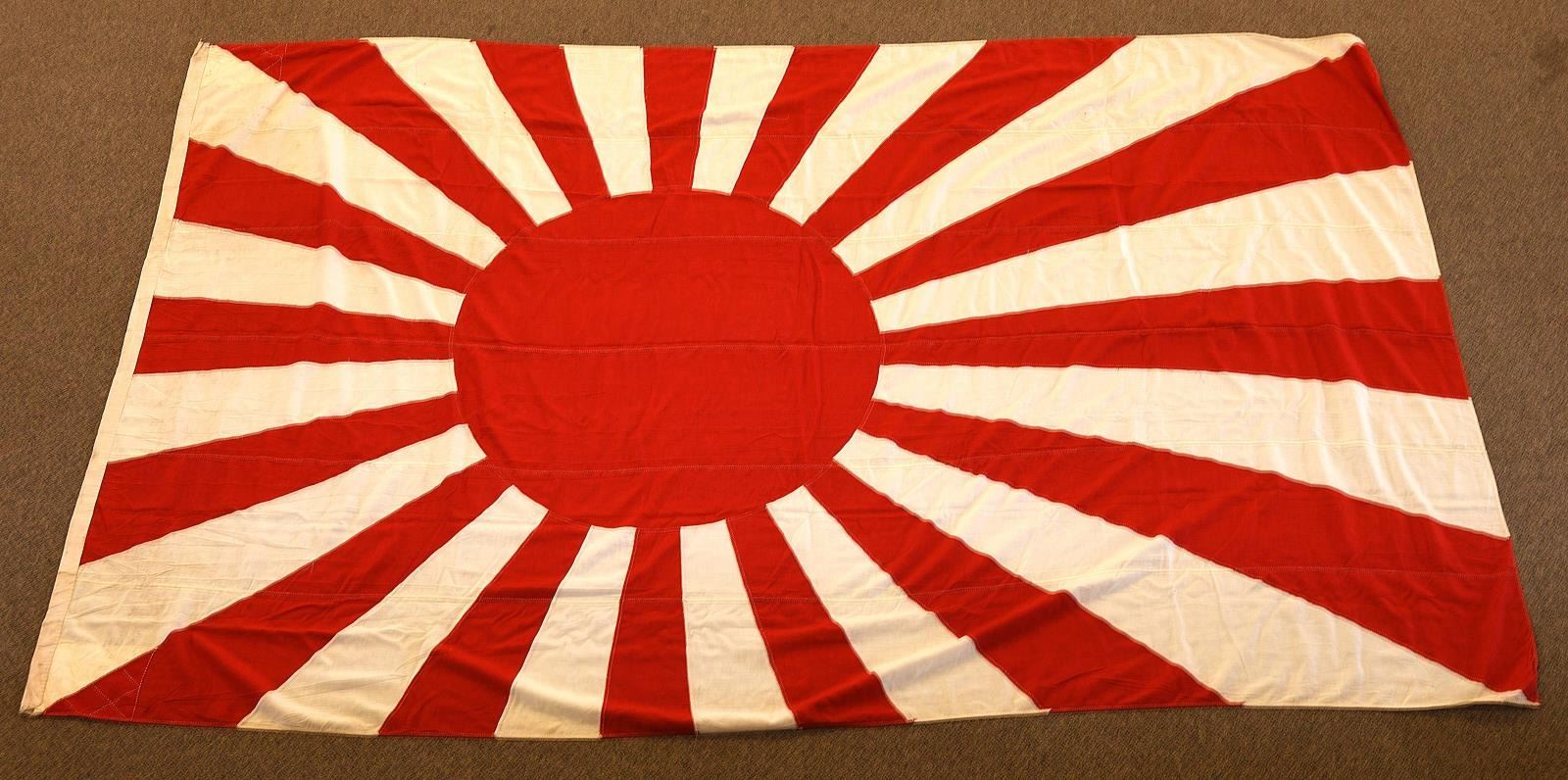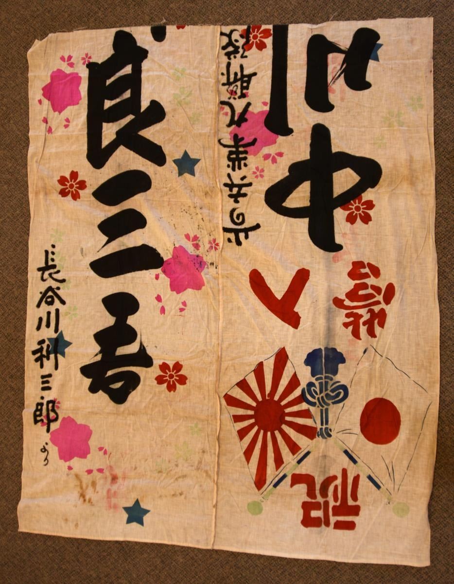 1) About 12 ½‘ x 7 ½‘ massive “rising sun”, all hand-sewn. 2” Wide, heavy cotton, reinforce-stitched hoist w/ sleeve for a rope. Rope is missing. CONDITION: overall, very good w/ fine colors, but has some soiling & staining. 2) 68” x 50” Patriotic panel w/ Kanji writing & a pair of crossed flags cut from a larger piece. CONDITION: good overall condition. 3) White silk panel w/ Kanji writing & reinforced leather corners. CONDITION: good overall condition. (02-19473-84/JS). $200-300.