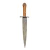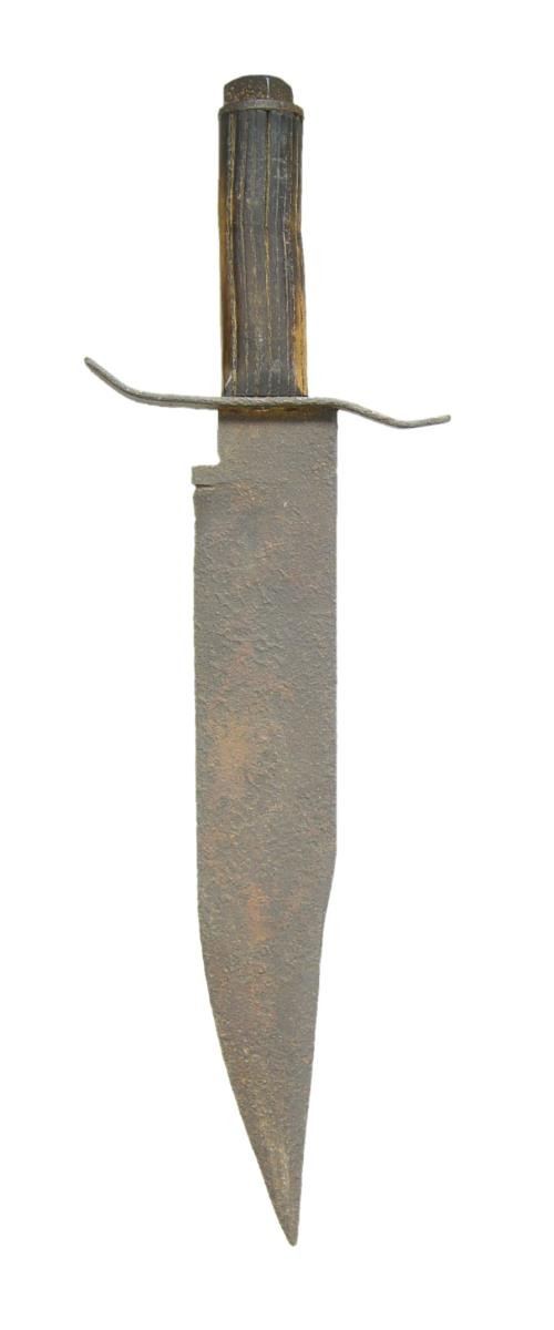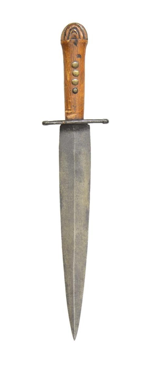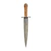 1) 14.5" Overall 10" well made double edged dagger blade / central spine, carved & tacked wood grip, w/ most unusual 3” carved horn cross guard. CONDITION: very good overall.