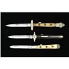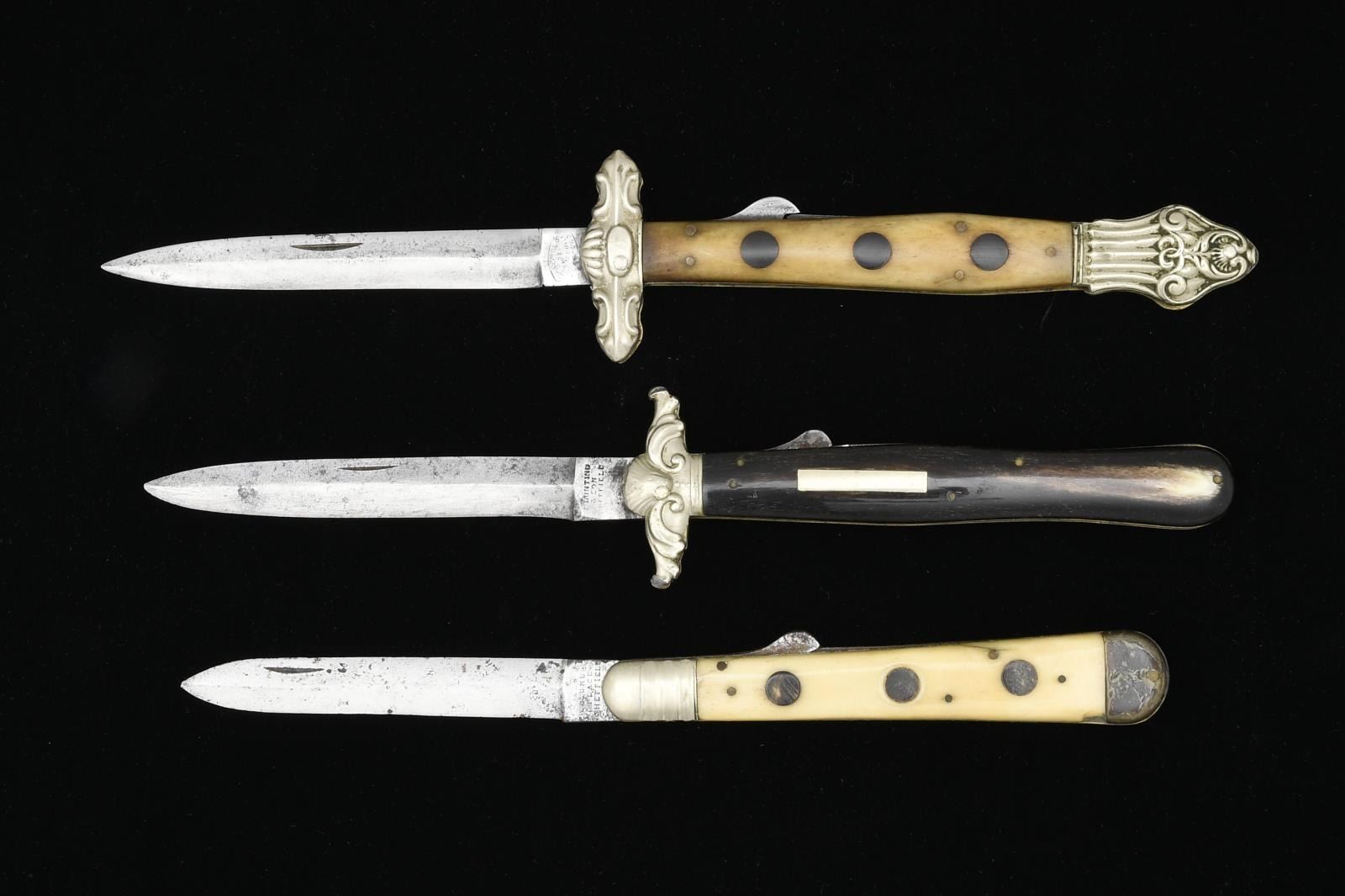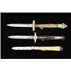 3) 8" Overall, 3.5" partially discernible “TILLOTSON” makers mark, polished bone grips, horn bolsters & inset discs. CONDITION: good to very good overall. (02-15585/JS). $1,200-1,500.