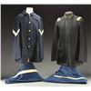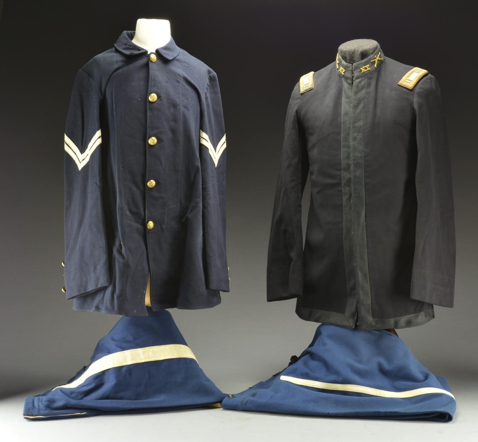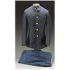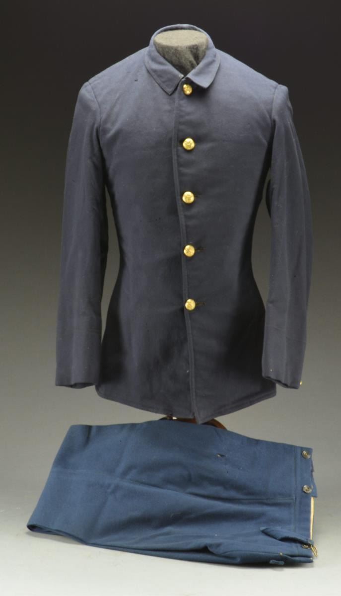 1) ENLISTED. An example of an enlisted dark blue uniform coat & associated pants likely made between 1883 & the Spanish American War. Coat has 5 buttons down the front & 3 on each sleeve. It has a blue/gray flannel lining & a single interior pocket. Sleeves are lined in muslin. Royal blue pants have a sizing strap in the back & 1 rear pocket on the right. The fly closes w/ 4 tin, 4 hole buttons & the waist secures w/ a similar button. Waist of pants is lined in muslin. CONDITION: coat & pants both are in very solid condition but show some minor mothing throughout.