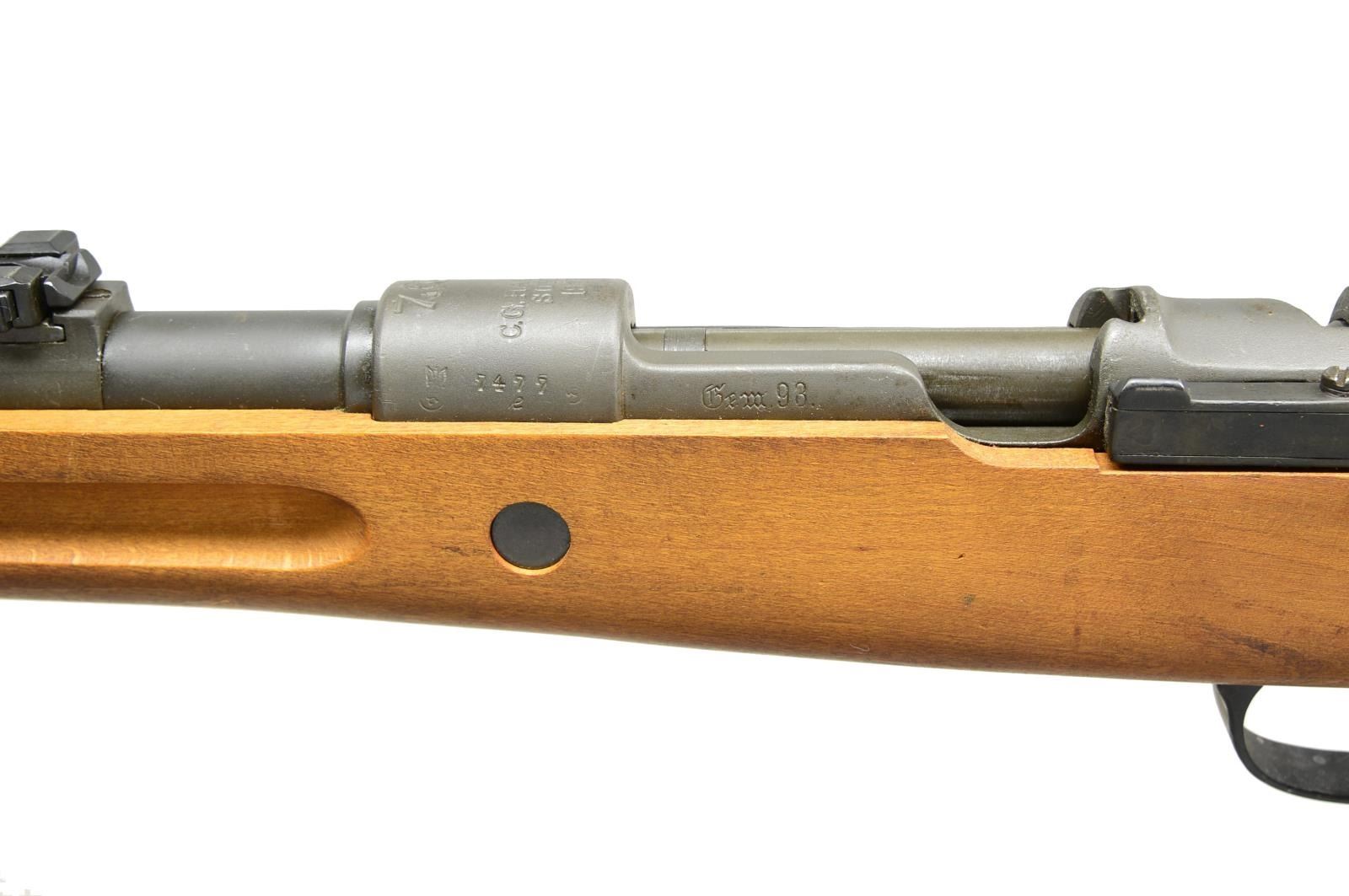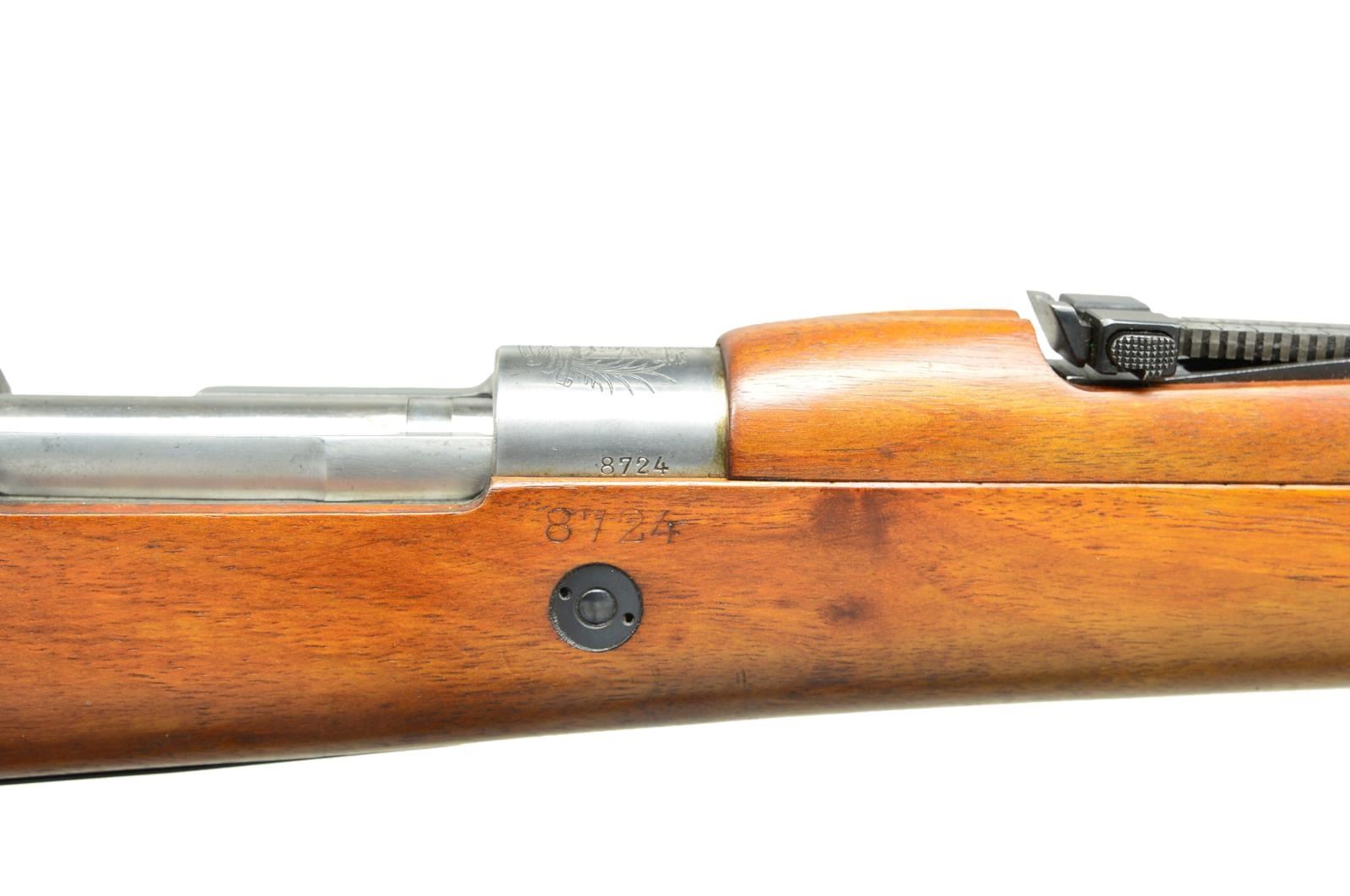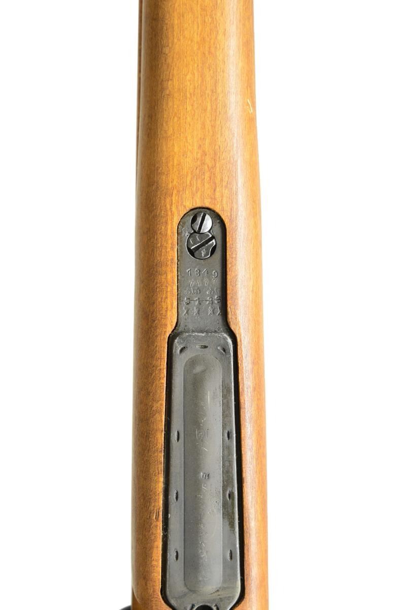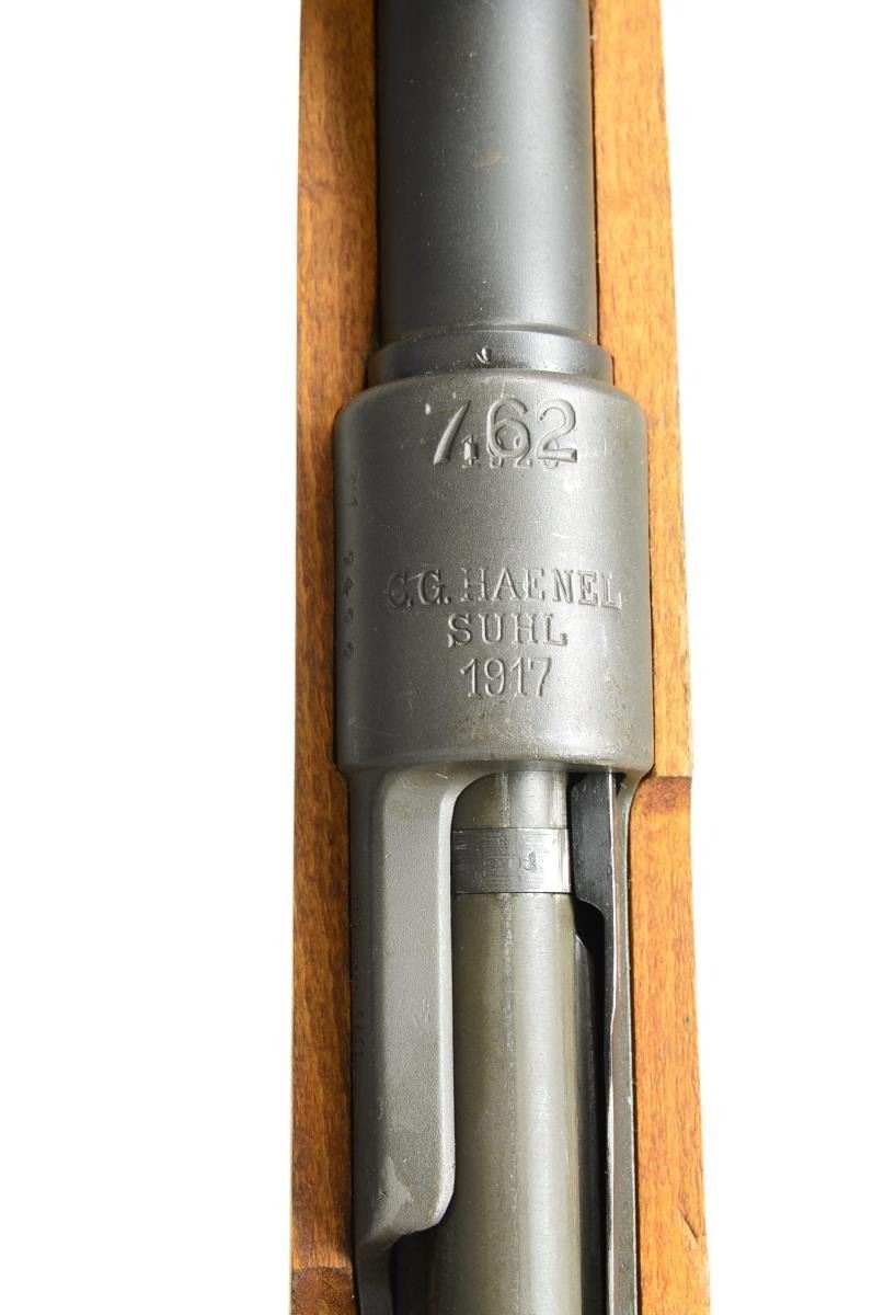 2) ISRAELI CONVERSION TO 7.62 NATO. Cal. 7.62 NATO. S# 7477E. Bbl. 23 5/8". All visible numbers match except for rear sight, upper band & trigger guard. Import marked on right side of rear sight sleeve. Turned down bolt handle. Receiver marked on left rail “GEW 98”, receiver ring marked on top “C. G. HAENEL SUHL 1917” & lg. numerals “7.62” to indicate cal. conversion from 8mm Mauser to 7.62 NATO. Entire rifle refinished & given replacement stock at time of rebuild. Tangent rear sight graduated to 2000m. Inverted V front sight w/ protective hood. Hood is retained by transverse rivet. Cleaning rod is not present. Bayonet bar is present. Mule bands, stamped trigger guard w/ removable floorplate, provision for side sling, cup type buttplate w/ takedown hole. Hardwood stock set, forend w/ grasping grooves. CONDITION: stock set has very light wear & scattered handling marks. Metal has gray arsenal reparkerization w/ light high point wear & scattered scratches. Near excellent, shiny bore. (21-2511/RW).