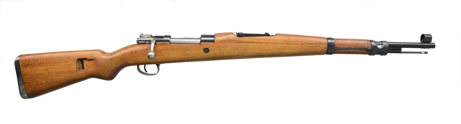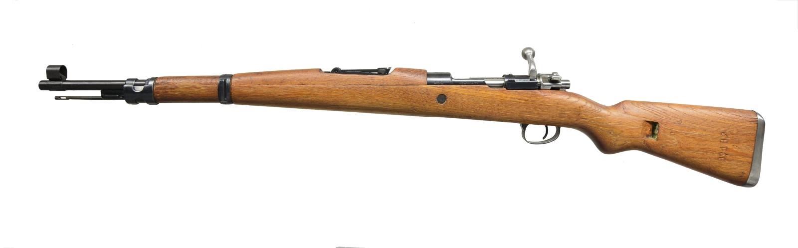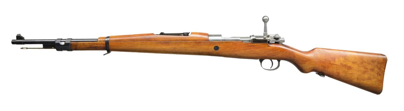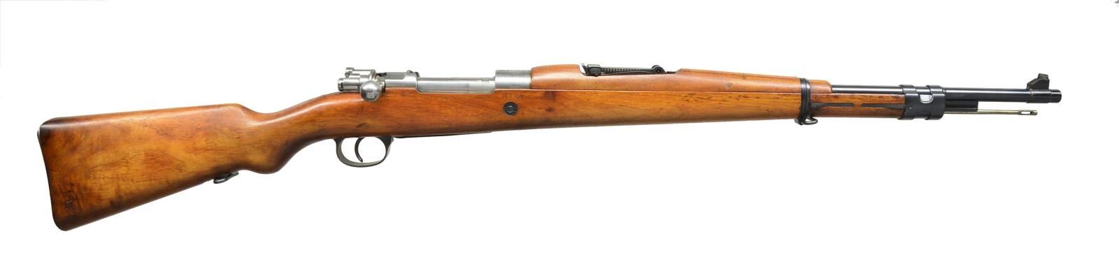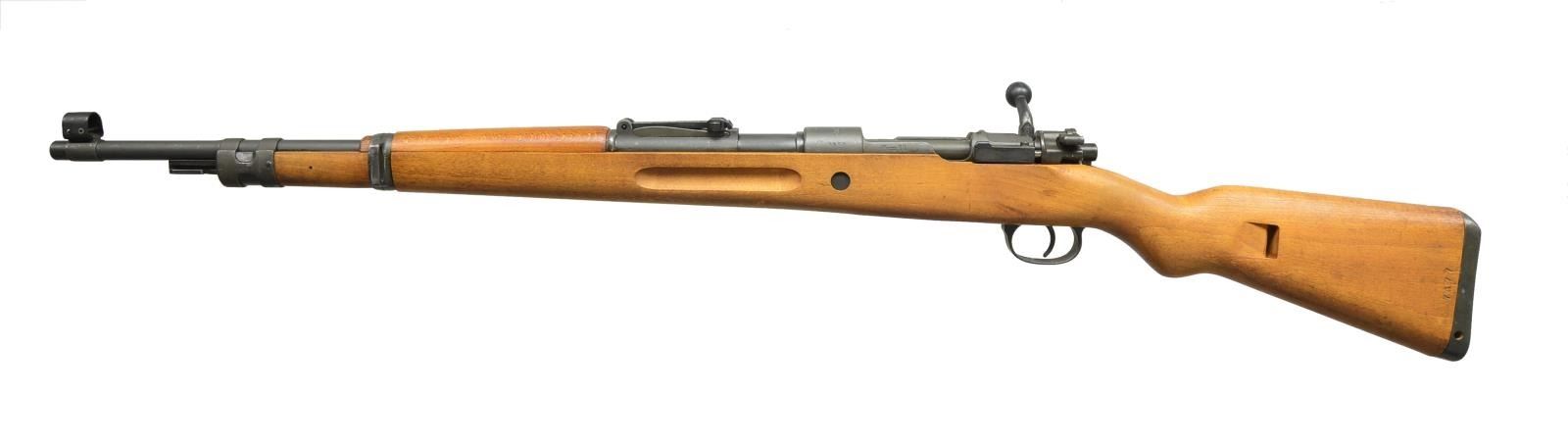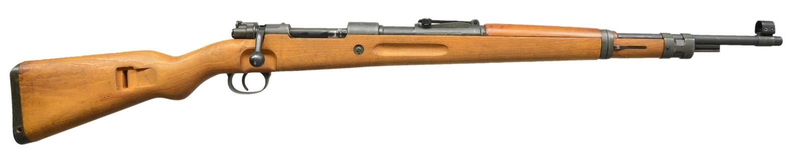 2) ISRAELI CONVERSION TO 7.62 NATO. Cal. 7.62 NATO. S# 7477E. Bbl. 23 5/8". All visible numbers match except for rear sight, upper band & trigger guard. Import marked on right side of rear sight sleeve. Turned down bolt handle. Receiver marked on left rail “GEW 98”, receiver ring marked on top “C. G. HAENEL SUHL 1917” & lg. numerals “7.62” to indicate cal. conversion from 8mm Mauser to 7.62 NATO. Entire rifle refinished & given replacement stock at time of rebuild. Tangent rear sight graduated to 2000m. Inverted V front sight w/ protective hood. Hood is retained by transverse rivet. Cleaning rod is not present. Bayonet bar is present. Mule bands, stamped trigger guard w/ removable floorplate, provision for side sling, cup type buttplate w/ takedown hole. Hardwood stock set, forend w/ grasping grooves. CONDITION: stock set has very light wear & scattered handling marks. Metal has gray arsenal reparkerization w/ light high point wear & scattered scratches. Near excellent, shiny bore. (21-2511/RW).