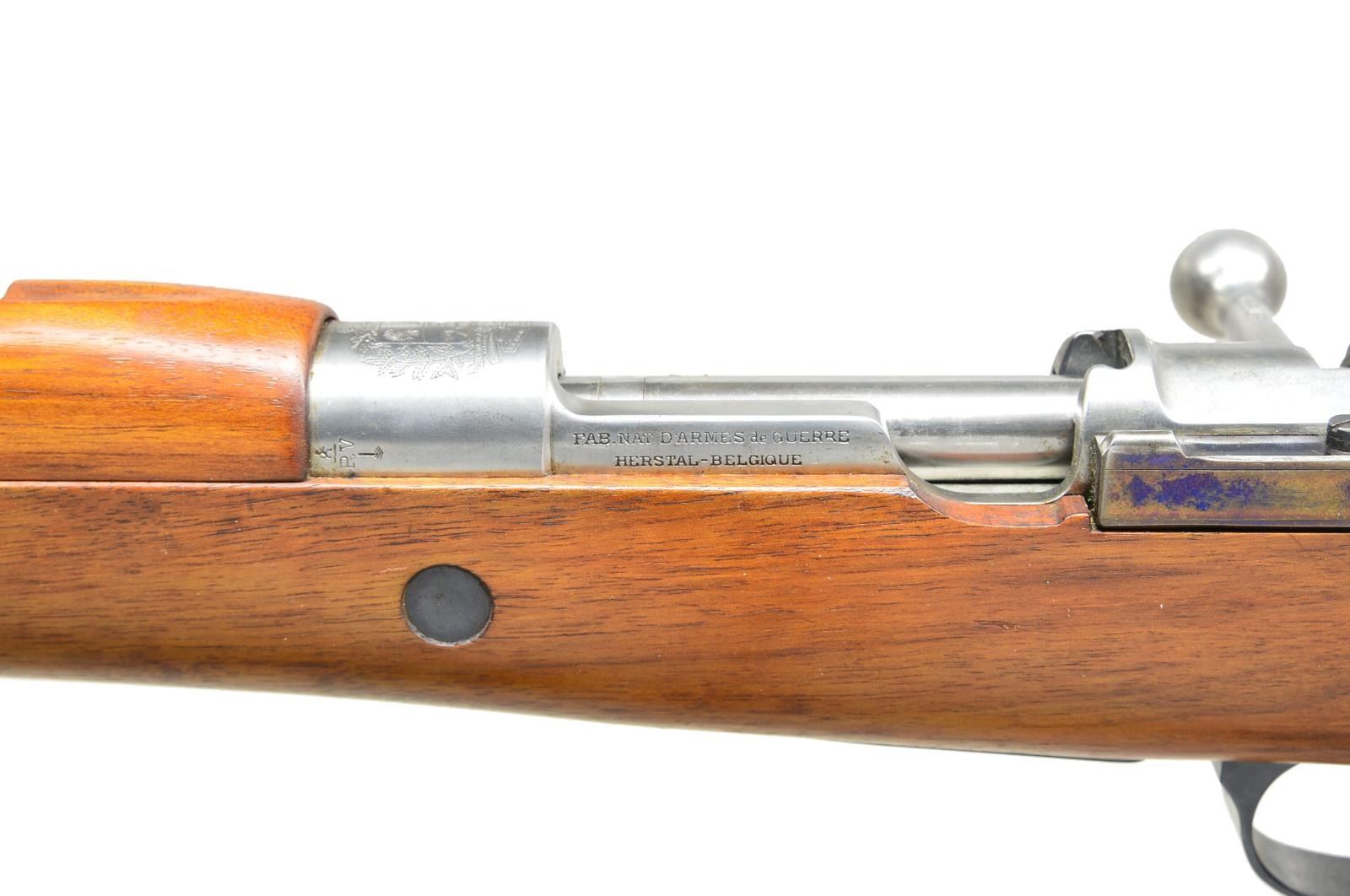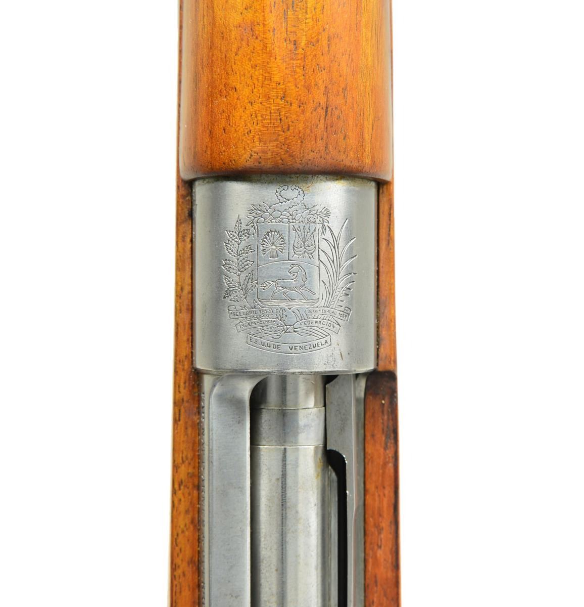 3) VENEZUELAN MODEL 24/30. Cal. 7x57 Mauser. S# 8724. Bbl. 23 1/ 4". All visible numbers match. Rifle mfg. by FN under contract to Venezuela. Receiver marked on left rail “FAB. MAT D’ARMES de GUERRE HERSTAL-BELGIQUE”. Receiver ring has crisp, Venezuelan crest. Straight bolt handle. Tangent rear sight graduated to 2000m. Inverted V front sight. Cleaning rod & bayonet bar are present. Matching walnut stock set. CONDITION: stock set has nice, rarely issued appearance w/ scattered sm. handling marks in original finish. Receiver & bolt are bright, balance of metal retains 90% original blue. Notable fire blue remaining on bolt stop. Very good, shiny bore. (21-2512/RW). ALL CURIO. $1,200-1,600.