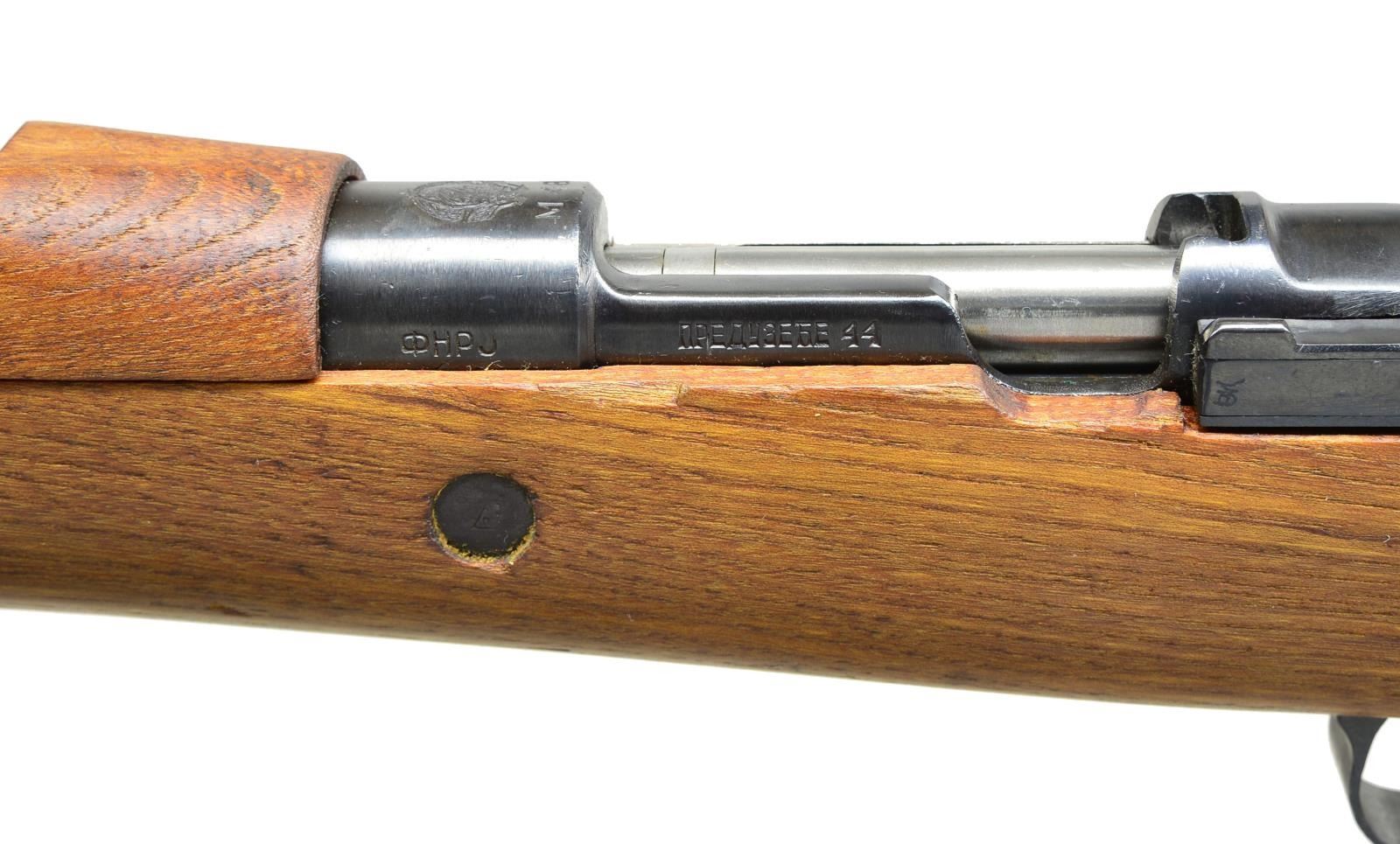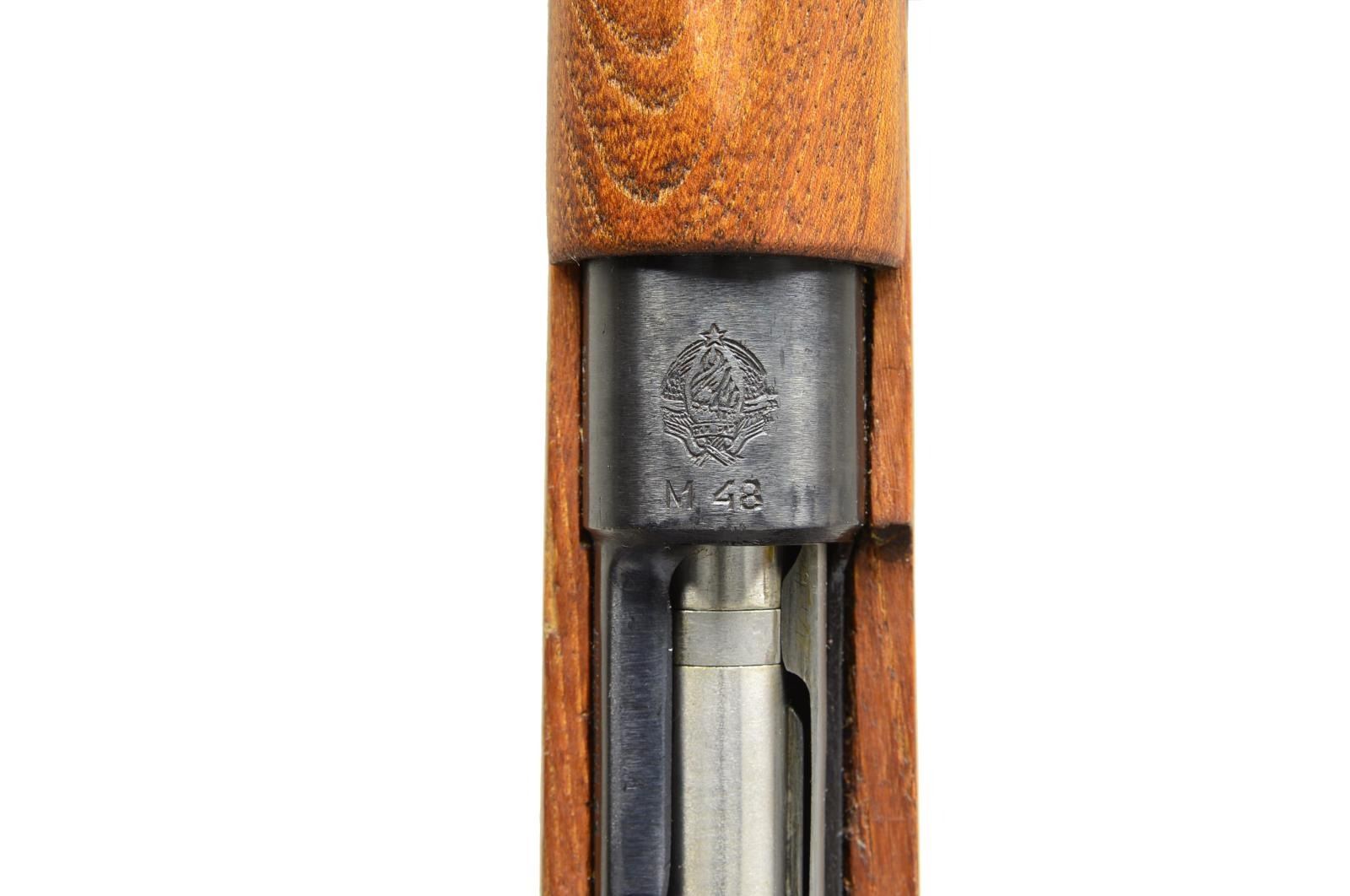 1) MODEL 48 YUGOSLAV MAUSER. Cal. 8mm Mauser. S# T80187. Bbl. 23 1/4". Numbers match on receiver, bolt, stock, floorplate. Import mark at bottom of bbl. Receiver marked on left rail w/ cyrillic letters & “44”. Receiver ring marked on top w/ Yugoslav crest & “M48”. Turned down bolt handle. Tangent rear sight graduated to 2000m. Inverted V front sight w/ protective hood. Cleaning rod & bayonet lug are present. Provision for side sling. Matching hardwood stock set w/ cup type buttplate. CONDITION: stock set has very light wear & scattered handling marks. Metal retains 90% original finish w/ light wear scattered scratches. Bore has lightly worn rifling, turning dark in grooves. (21-2494/RW).