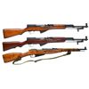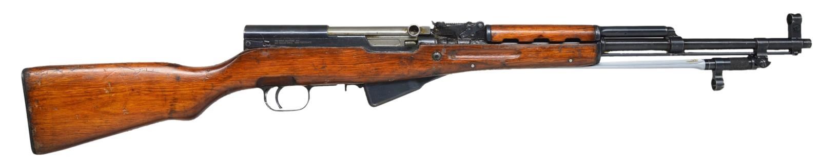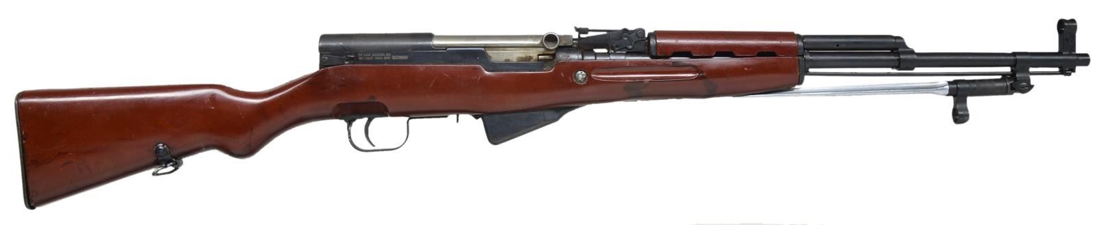 1) CHINESE SEMI-AUTO SKS CARBINE. Cal. 7.62x39. S# 10150675. Bbl. 23 1/4". Import marked on right side of receiver. All visible numbers match. Receiver marked on left side w/ triangle "26" indicating manufacture at Jianshe arsenal. Tangent rear sight graduated to 1000m. Post front sight w/ protective hood. Cleaning rod is present. Folding 12 1/4" spiked bayonet. Hardwood stock set. CONDITION: stock set has moderate wear, dents, staining & scratches throughout. Metal retains 60% blue w/ thinning wear & scratches. Very good, shiny bore. (21-695/RW). 2) CHINESE SEMI-AUTO SKS CARBINE. Cal. 7.62x39. S# SKS18680. Bbl. 20 3/8". All visible #'s match original serial number on left side of receiver. Import marked on right side of receiver. Left side of receiver marked w/ triangle "26" indicating manufacture at Jianshe arsenal. Tangent rear sight graduated to 1000m. Post front sight w/ protective hood. Cleaning rod is present. 12" Folding spike bayonet. Brown polymer stock set. CONDITION: stock set has light wear, scattered dents & handling marks. Metal has 80% blue finish w/ light wear & scratches. Very good, shiny bore. (21-710/RW). 3) MODEL 1938 RUSSIAN BOLT ACTION CARBINE. Cal. 7.62x54R. S# M39801. Original S# 92394 matches on all visible parts. Bbl. 20 1/4", import marked at bottom. Straight bolt handle marked w/ hammer & sickle in wreath indicating mfg. at Izhevsk arsenal. Bbl. dated 1943. Tangent rear sight graduated to 1000m. Post front sight w/ protective hood. Cleaning rod is present. Laminated hardwood stock set. Green web sling w/ leather collars. CONDITION: stock set has light wear, flaking & handling marks w/ arsenal rework finish. Metal has 85% arsenal rework finish w/ light wear & handling marks. Fair, worn bore turning dark. (21-712/RW). ALL CURIO. $700-900.