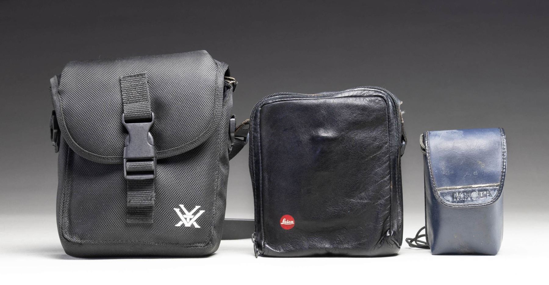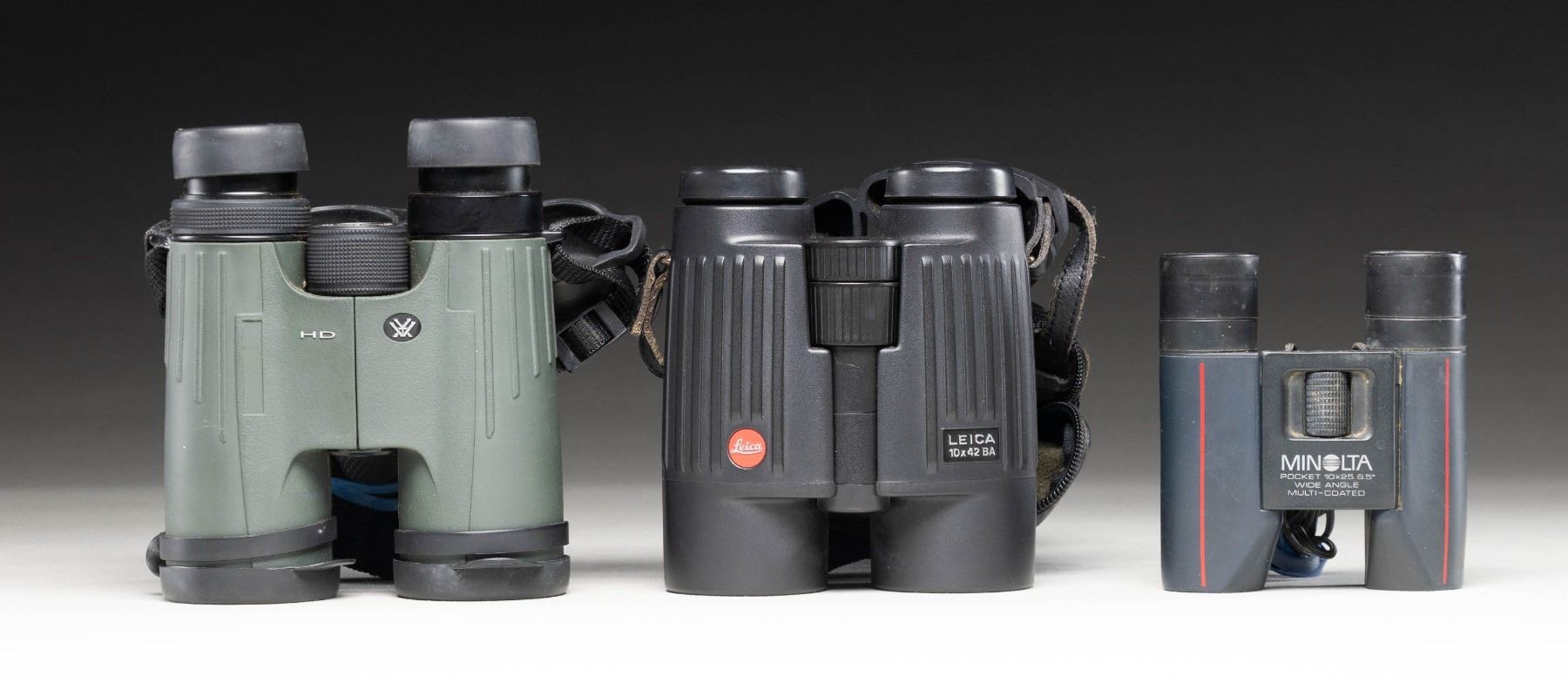 1) 1- "Leica" 10 x 42 BA binoculars with roof prism, black finish with lens protector and soft leather case. CONDITION: very fine; optically crystal clear, missing small cover on top hinge. 2) 1- "Vortex Viper" HD 8 x 42 roof prizim binoculars, green and black with lens covers, strap and black case. CONDITION: very fine; optically clear. 3) 1- "Minolta Pocket" 10 x 25 roof prism folding binoculars, black finish in black vinyl case. CONDITION: fine; a bit dusty, optically clear. PROVENANCE: From the Private Collection of Berrien Moore III. (02-25882/MGM). $700-1,000.