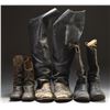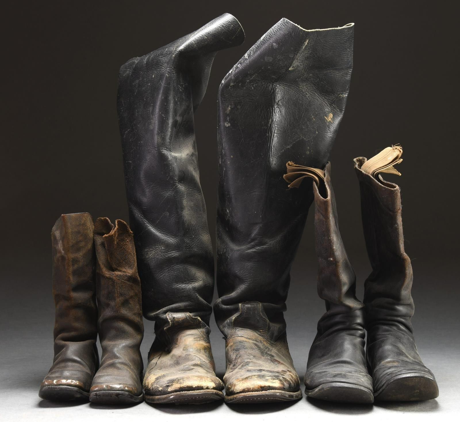 1) Boots have a 10" shin, measuring 7.5" from heel to toe w/ a 2" width. 2) Boots have a 13" shin, measuring 9" from heel to toe w/ a 3" width. Elastics attached along top edge. 3) Boots have a 23" shin, measuring 11.5" from heel to toe w/ a 4.25" width. CONDITION: boots are in fair to good overall condition, showing some use, cracking, & mud residue. PROVENANCE: from the Lifelong Collection of Glen E. Mattox. (02-18947/MD). $50-150.
