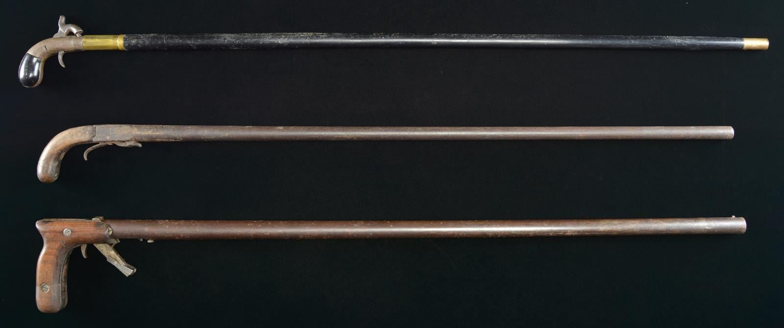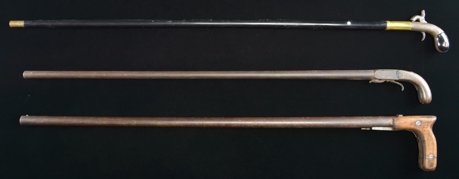 3) Cal. 31. NSN. Bbl. 3 1/2" octagon to round w/ smooth bore. Unmarked round bodied action w/ center mounted hammer & trigger having black bakelite bag type grips. Pistol inserts into 32 1/2" tubular bakelite cane body w/ brass fittings at both ends. CONDITION: pistol has gray appearance. Hammer will not hold at full cock. Nipple is beat over. Cane body shows light wear & scratches. (01-21832/DS). ANTIQUE. $800-1,200.