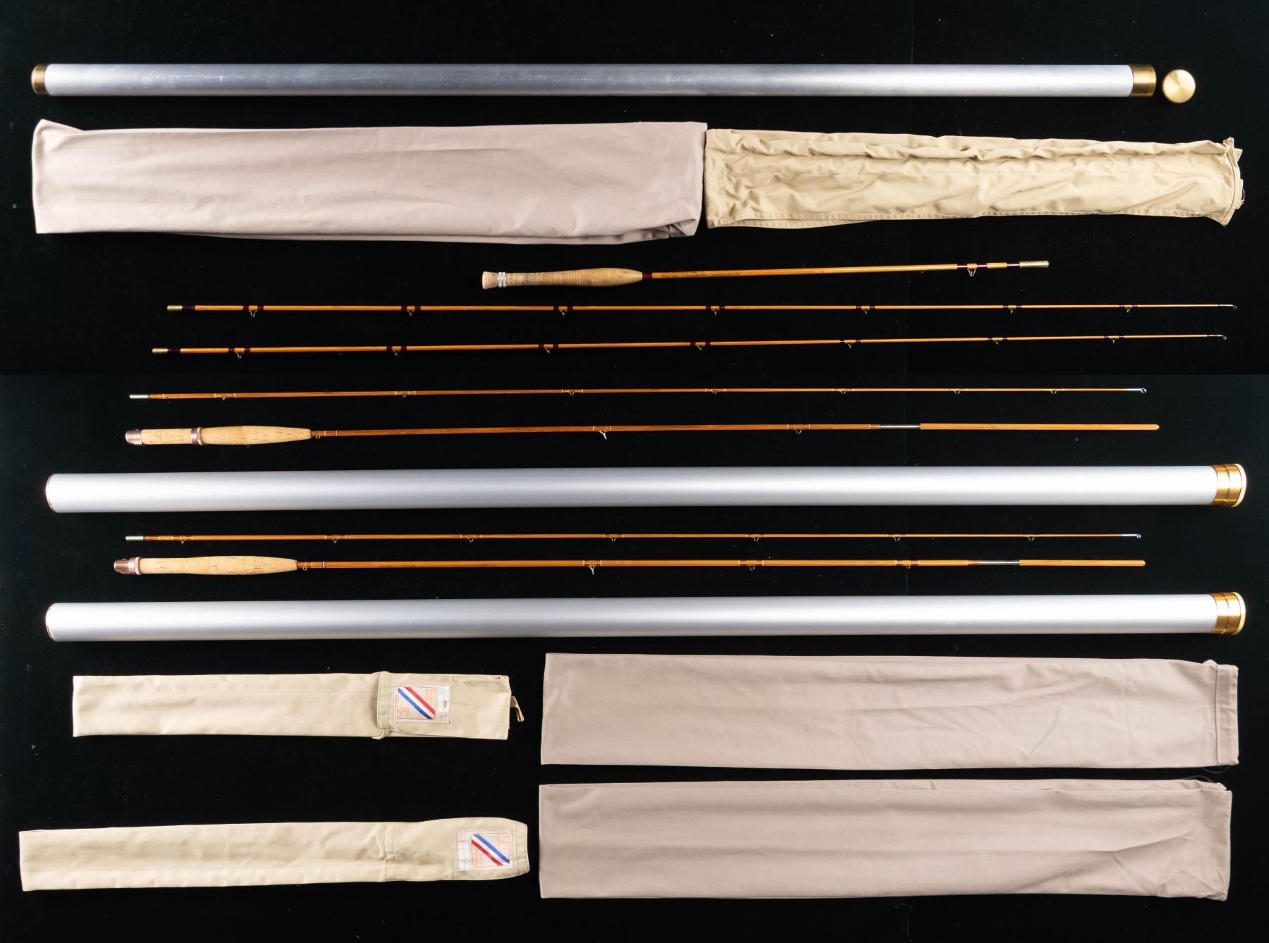 1) Custom made Pezon et Michel bamboo fly rod. 7'-2", 2 piece, 2 tips, (4 weight ?), staggered ferrule, marked "PEZON ET MICHEL/PARIS" "LE PETITE FARIO CLUB/7'2"-3.0 OZ." "Mike Cohen/53 Grand View Place/Upper Montclair, N.J.", with original bag and tube. CONDITION: fine. Showing little use. Handle slightly dark. 2) Pezon et Michel "Parabolic Royale" bamboo fly rod. 7'-9", 2 piece, 1 tip, 5 weight, staggered ferrule, marked "Parabolic Royale" "7'9"-2.36" ".99 GRS. 3-1/2 oz #5" "Perzon et Michel" "Made in France", in factory bag and unmarked tube. CONDITION: very fine. Remnants of original wrap on handle with slight soiling. 3) Pezon et Michel "Parabolic Royale" bamboo fly rod. 8'-3" 2 piece, 1 tip, 5 weight, staggered ferrule, marked "Parabolic Royale" "8'3" 2M 5L" "11.5 GRS 4-1/8oz. - #5" "Pezon et Michel" "Made in France", with factory bag and unmarked tube. CONDITION: lightly used. Some roughness of varnish. PROVENANCE: From the Private Collection of Berrien Moore III. (02-25866-9/MGM). $800-1,200.