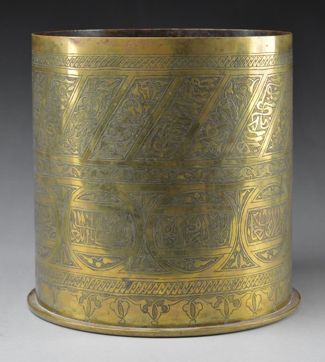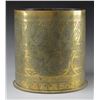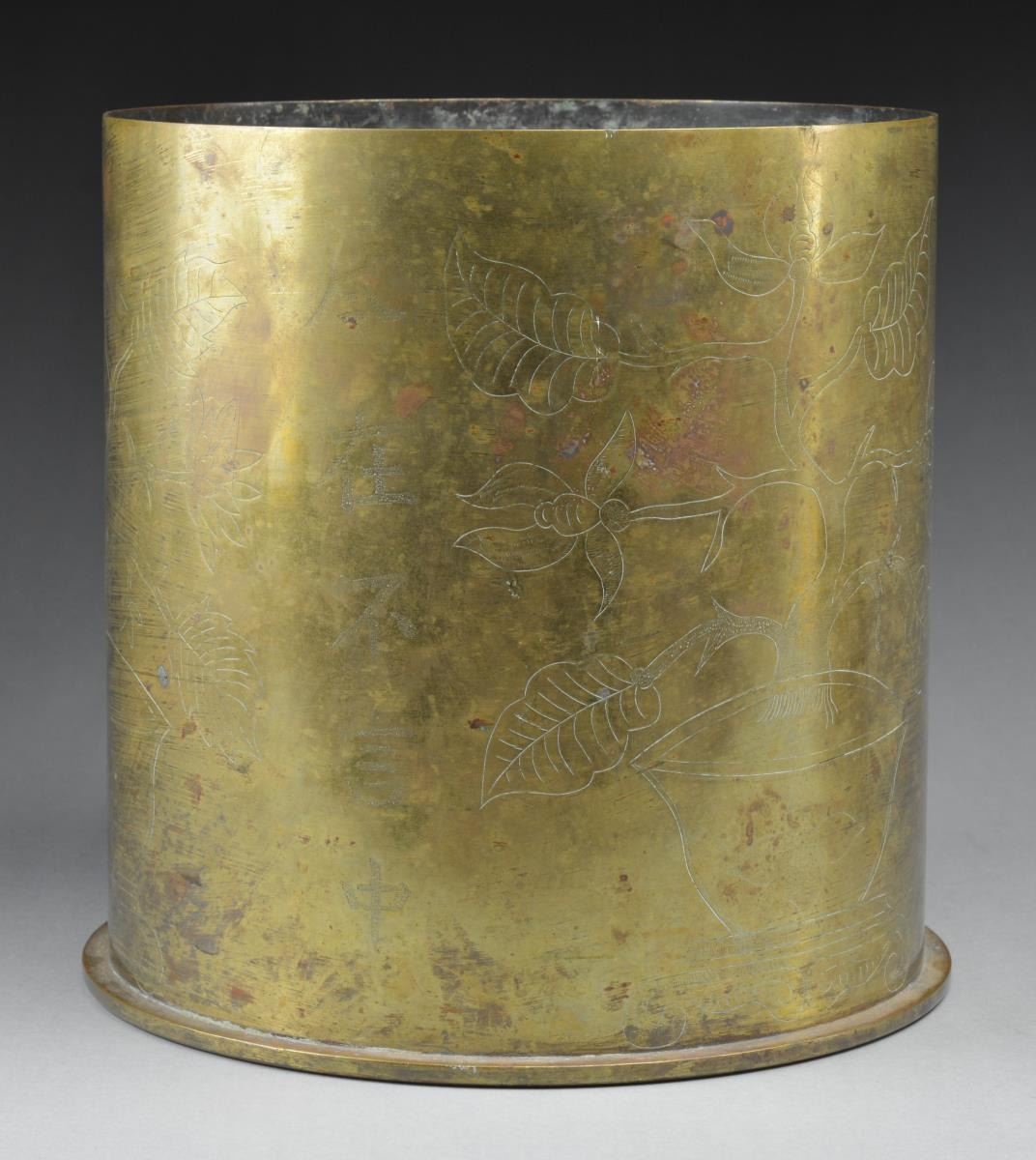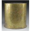 1) German 1917 dated brass artillery shell, approx. 8.5" in dia. Shell is engraved of Middle Eastern inspired geometric patterns w/ punch dot backgrounds. CONDITION: brass has a pleasing mellow brown patina on exterior w/ extensive verdigris & patina on interior.