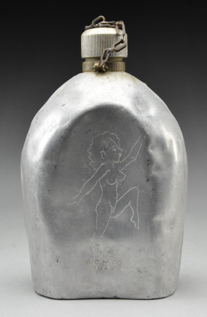 5) US WWII A.G.M. CO 1942 dated canteen. Canteen has Phillipine inspired punch dot engraving. One side engraved "DUTCH NEW GUINEA", palm tree over "MJR / NEW GUINEA / MILNE BAY" & "PHILIPPINES / LEYTE". Other side engraved w/ portrait of naked dancing lady over US mfg. stamp. CONDITION: canteen in good intact condition w/ numerous dents & spots of patina. (02-16454/MD). $300-450.