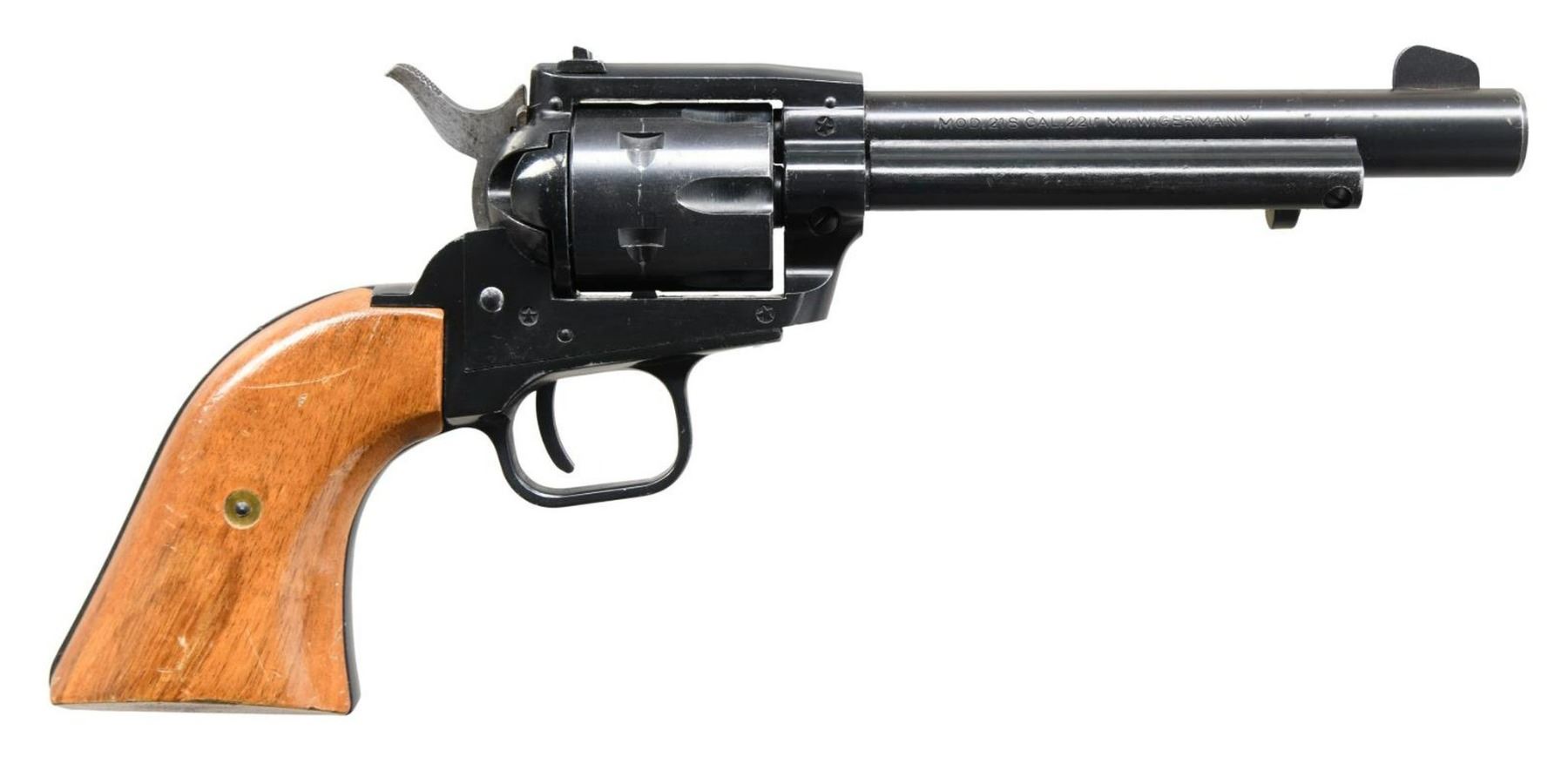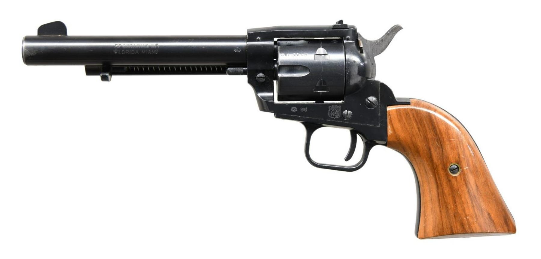 1) SPORT ARMS 21S SA. Cal. 22 LR. S# 771093. Bbl. 5 1/2". Blade front sight. Square notch rear sight. West German made Western style revolver. Blued & anodized finishes. Hardwood grips. CONDITION: grips show some flaking varnish, dings & handling wear. Metal retains 85% original finish w/ some oxidation specks, scattered flaking, a drag line on cyl. & some edge wear. Good bore. (23-4695/MJC). MODERN. 2) TANGFOGLIO 7A766 SA. Cal. 22 LR. S# C71844. Bbl. 6". Round blade front sight. Notch rear sight. Italian made Western style revolver. Anodized finish. Hardwood grips. CONDITION: grips show some handling wear, dings & flaking varnish. Metal shows scattered fading to gray & oxidation. Very good bore. (23-4703/MJC). MODERN. 3) SPANISH ALAMO RANGER DA. Cal 38 Spl. S# 5957. Bbl. 5 3/8". Round blade front sight. Fixed rear sight. Spanish made Western style double action revolver. Case colored frame. Blue bbl & anodized ejector rod housing. Checkered hardwood grips. CONDITION: grips show scattered dings, scratches & handling wear. Metal shows overall fading & scattered oxidation. Good bore w/ strong rifling. (23-4707/MJC). CURIO. $250-450.