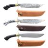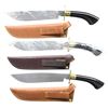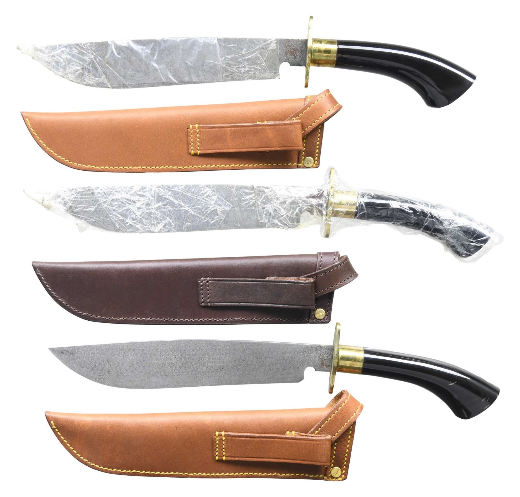 These beautifully curved hand forged Damascus bladed knives were originally designed for hacking through the Malay jungle and saw extensive use in the construction of thatched roof huts. Handles are polished genuine buffalo horn and the sheaths are rugged buffalo hide. A great field knife for hacking through brush or general camp chores. Feel free to use these knives hard, as they can take it with ease. The knives were forged entirely by hand by their own old world craftsmen and should not to be confused with cheap "Damascus" looking knives on the market. The knives measure 16" in the sheath. The blades are 9 1/2" in length and a sturdy 1 5/8" in width. The hilts are 5 3/4" in length with 1-piece buffalo horn grips. The heavy oval shaped guards are made of brass, as are the large ferrules above the guard. These fine bladed weapons are equipped with their own custom leather sheaths, boldly marked "Roosevelt & Drake". CONDITION: like new with only storage wear. PROVENANCE: from the renowned collection of quality sporting arms from Lewis Drake together with inventory of Lewis Drake Associates. (02-23573-18/BF). $500-900.