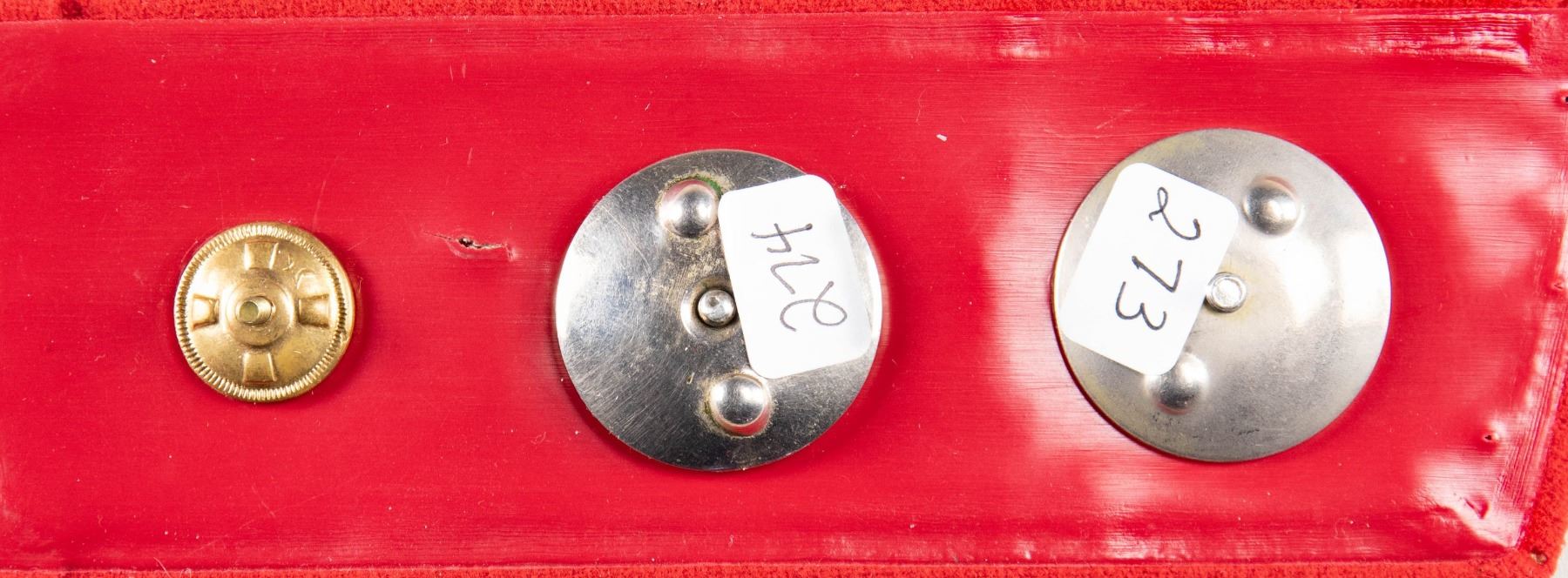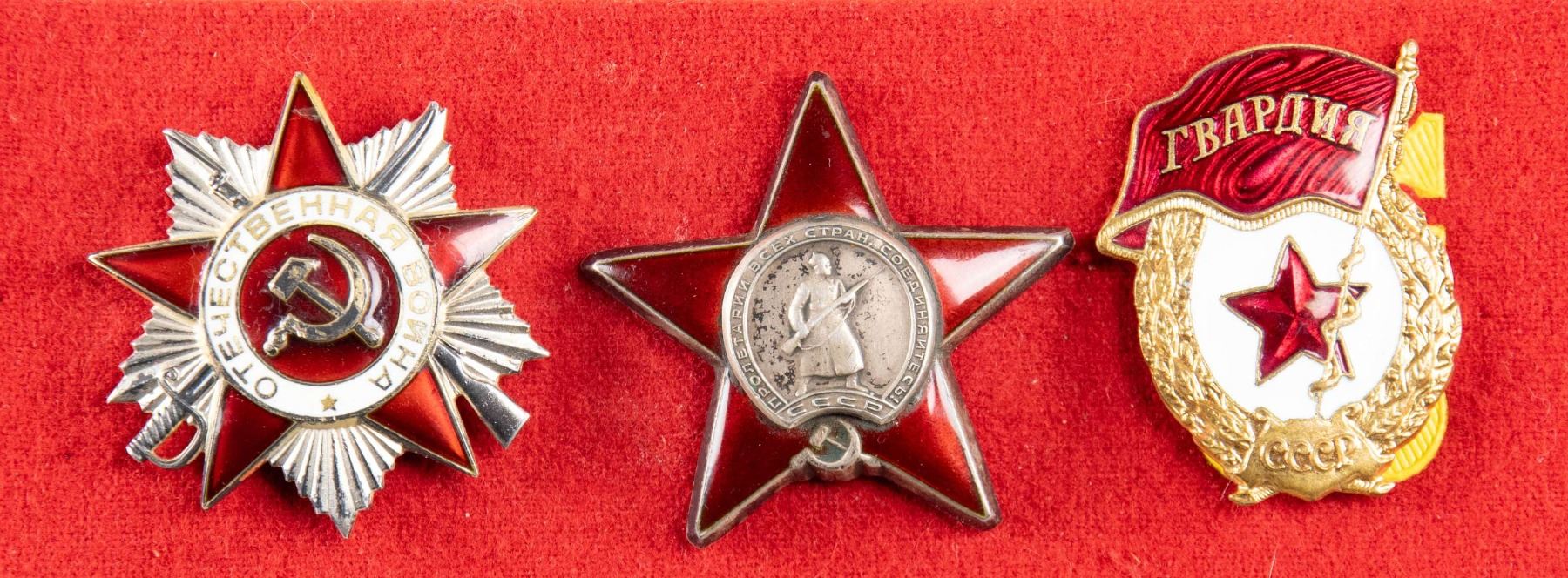 This group of 3 Russian military badges includes the Soviet Guards Badge, the Russian Order of the Patriotic War #5957729, and the Russian Order of the Red Star #1558246. CONDITION: all 3 badges show light wear. PROVENANCE: Estate Collection of John "Jack" Dhooghe. (02-25588/BF). NON-GUN. $150-250.