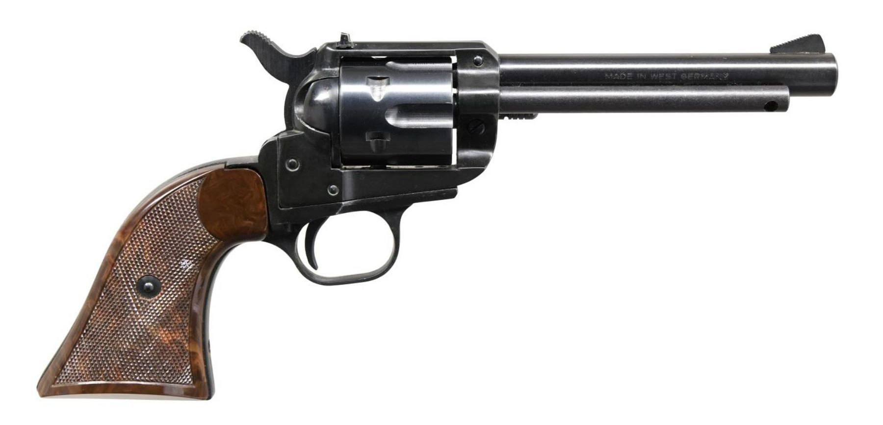 1) HERTER'S. S# 91981. Bbl. 5". Serrated ramped blade front sight. U-notch rear sight. West German made SAA style revolver. Blue & anodized finishes. Brown synthetic checkered grips. CONDTION: grips are loose w/ bottom of left panel missing a large 2" long section, grips otherwise show some staining & handling wear. Metal retains 80% finish w/ some staining, light oxidation, a drag line on cyl. & scattered fading. Very good bore. (23-4700/MJC). 2) HAWE'S. S# 291311. Bbl. 4 3/4". Round blade front sight. Fixed rear sight. German made Western style revolver. Blued & anodized finishes. Checkered black grips that display a poor fit. CONDITION: grips show scattered chipped points, handling wear & scratches. Metal retains 70% original finish w/ a drag line on cyl., scattered flaking, scratches & handling wear. Good bore that will likely clean up better. (23-4701/MJC). 3) FIE E15. S# TB95082. Bbl. 4 1/2". Round blade front sight. U-notch rear sight. Italian made Western style revolver. Checkered factory grips w/ right hand thumb rest. CONDITION: grips show a loose fit w/ some chips, dings, worn checkering & handling wear. Metal shows overall fading to gray, some light oxidation & light pitting on top of bbl. Good bore. (23-4702/MJC). ALL MODERN. $200-450.