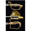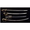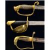 1) M1832 MARINE CORPS NCO. Overall length: 37 1/4". Blade length: 31 3/4". Single fullered, unmarked, etched blade. Brass eagle head hilt w/ brass spade languets. Wire wrapped, leather covered grip. No scabbard. CONDITION: blade has a dark patina & shows evidence of sharpening. Hilt is a bit loose & slightly misshaped. Grip is well worn but retains most of the leather covering & all of the wire. 2) CIVIL WAR NAVY PRESENTATION GRADE. Overall length: 36". Blade length: 30". Single fullered blade etched w/ nautical & naval motifs marked near the ricasso, “MILLER & CO NEW YORK”. Gilded brass hilt w/ “USN” in ribbon on underside of guard. Figured sheet silver grip. No scabbard. CONDITION: blade has a medium gray patina but etching remains sharp. Hilt shows areas of original gilding but is loose. Grip has a sm. split. 3) M1860 NAVAL CUTLASS. Overall length: 32". Blade length: 26". Single fullered blade has no markings at all. Despite the fact that the blade is unmarked in any way, this does appear to be an original cutlass. The scabbard & frog are certainly original & the sword shows age & use but seems heavy as compared to other examples. Brass cup hilt. Leather wrapped grip. Copper riveted leather scabbard & frog. CONDITION: blade shows light wear w/ a few nicks on the edge. Guard has shallow dents to the cup. Grip is worn but intact. Scabbard is missing the very tip but remains solid otherwise. Frog shows wear & flexing but remains quite solid. (02-14231(3)/BF). $1,000-1,600.