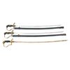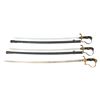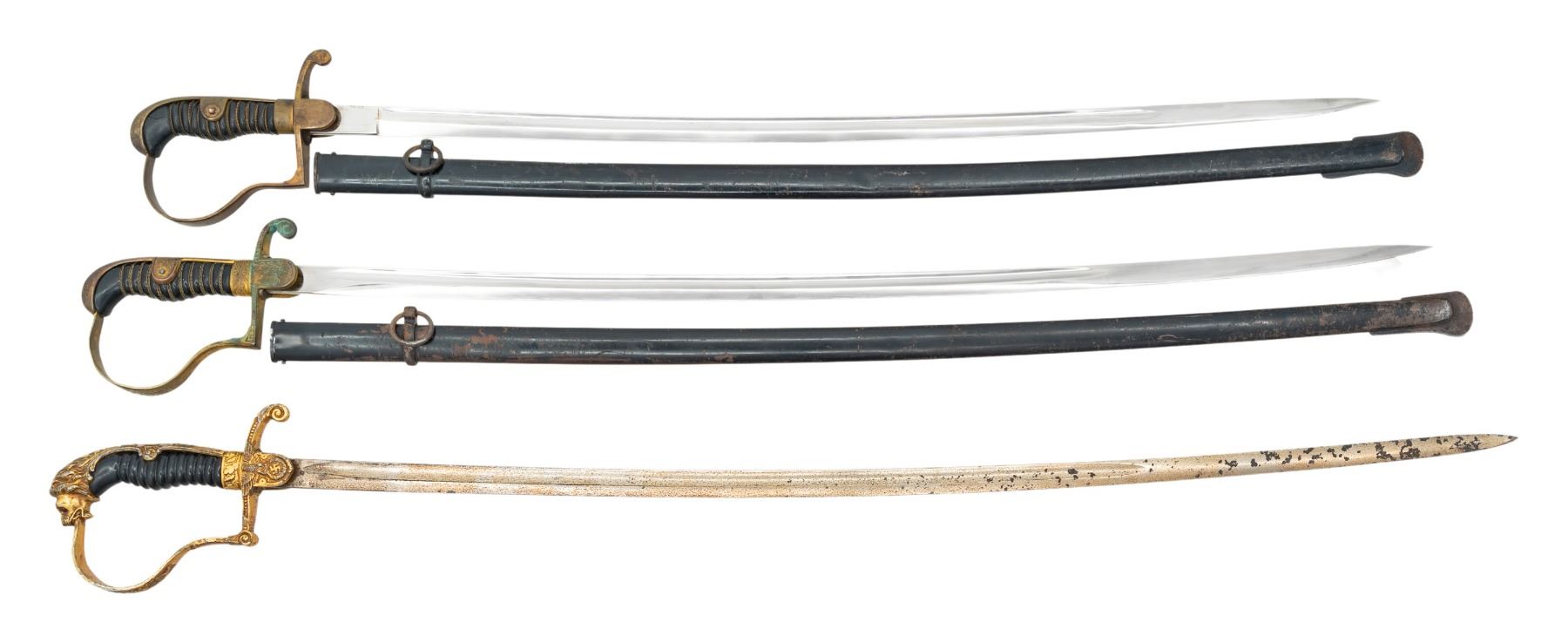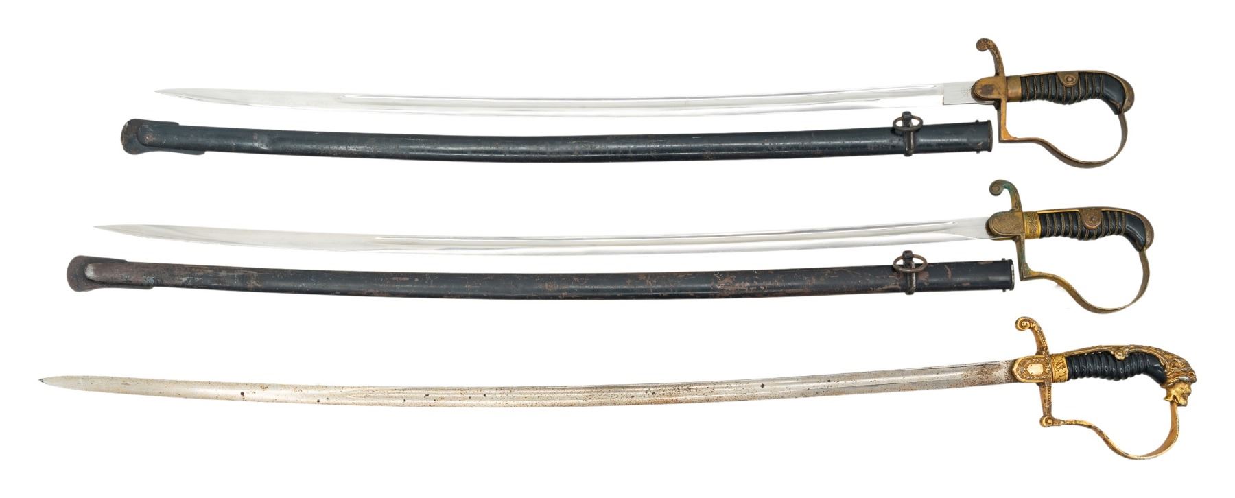 1) WWII German Army officer's sword measuring 36 1/2" overall with a plain blade marked "EMIL VOOS (logo) SOLINGEN". Gilded brass hilt with reverse P knuckle bow and a droop wing eagle and Party symbol on the langet. Nice dove head pommel. Wire wrapped black composite grip with black enameled steel scabbard. CONDITION: blade has substantial original factory polish. Hilt shows moderate wear with 40% of gilding remaining. Scabbard finish is about 70% intact. 2) WWII German Army officer's sword measuring 38 1/2" overall with a plain blade marked "(logo) WKC". Gilded white metal hilt with reverse P knuckle bow and a spread short winged eagle above wreath on the langet. Nice lion head pommel with "ruby" eyes (1 missing). Black composite grip with no wire. No scabbard. CONDITION: blade has wear and some loss of plating. Hilt shows moderate wear with 80% of gilding remaining. 3) WWI German Army officer's sword measuring 34" overall with a plain blade marked "ALCOSO (logo) SOLINGEN". Gilded brass hilt with reverse P knuckle bow and a blank langet. Dove head pommel. Wire wrapped black composite grip with black enameled steel scabbard. CONDITION: blade has substantial original factory polish. Hilt shows moderate wear with only traces of gilding remaining. Scabbard finish is about 85% intact. (02-25314/BF). NON-GUN. $400-600.