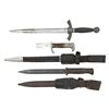 1) A 1st model Luftwaffe dagger with no scabbard measuring 17 5/8" in length. The blade has no markings and the mounts have had the Party symbols removed. Wire wrapped leather grip. CONDITION: a relic in poor condition but the grip is salvageable. 2) Mauser K-98 bayonet with scabbard and frog. CONDITION: bayonet shows wear and oxidation. Serial numbers do not match. frog is solid. 3) A WWII Police dress bayonet with an overall length of 19 1/8". The blade has been cut to 3" in length. Plated hilt with eagle pommel. 2 piece stag grips with Police eagle on the front grip. Leather scabbard with plated mounts complete with frog. CONDITION: blade cut to 3". Hilt shows light wear and the scabbard shows heavy wear and losses to the leather's finish. Frog is complete. (02-25415/BF). NON-GUN. $300-400.
