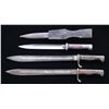 This lot includes 2 M1898\05 bayonets, each measuring 19 7/8" overall with two-piece wooden grips. Neither bayonet has a scabbard. / 1 Mauser K98 bayonet, numbered "1747," with a scabbard numbered "5850." The bayonet has two-piece composite grips and a leather frog. CONDITION: the two M1898 bayonets have dark patinas on the blades and moderate wear to the hilts. The K98 bayonet has a sharpened blade. (02-23430/BF). $200-300.