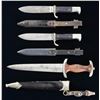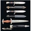 1) NSKK DAGGER. Overall length: 14 3/4". Blade is etched “Alles fur Deutschland” on one side & “RZM M7/13” on the other. Plated crossguard & pommel guard. Wooden grip w/ plated eagle & brown enamel SA button. Plated mounts on the black enameled scabbard. Original hanger attached. CONDITION: blade shows scabbard wear & some staining. Finish is bubbling on the dagger mounts & scabbard mounts. Eagle has lost most of its plated finish. Scabbard body retains 95%+ original finish. Hanger shows moderate wear. 2) HJ KNIFE. Overall length: 10 1/8”. Blade is etched “Blut und Ehre!” on one side. The other side is stamped “RZM M7/4_ 1937 (knight’s head) W K C SOLINGEN”. Polished steel guard & bird head pommel. 2-Piece black composite grips, w/ front grip having the enameled HJ diamond. Sheath shows a blued finish w/ black leather belt loop & retention strap. CONDITION: blade has seen some kind sharpening. The knife, overall, shows light wear. 3) HJ KNIFE. Overall length: 10”. Blade is stamped “RZM M7/13”. Plated guard & bird head pommel. 2-Piece black composite grips, w/ front grip having the enameled HJ diamond. Sheath shows a black enameled finish w/ black leather belt loop & retention strap. CONDITION: blade has seen light sharpening and has some minor staining. The rear grip has a small hole. The finish is worn off the tip of the sheath. (02-21056-5/BF). $600-800.