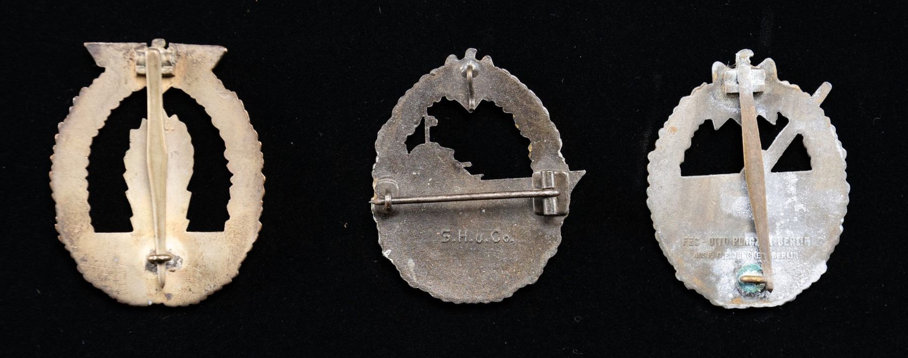 1) MINESWEEPER. An exceptionally well made Minesweeper War Badge which appears to be copper or high copper content brass. The explosion and the water are silver plated and worn to the copper at the high points. The badge is slightly vaulted and the reverse has a light silver plating. The top of the explosion is marked " R.K. " . Wide pin. CONDITION: plating on the front shows wear to the high points. Hinge, pin and catch are present. 2) DESTROYER. This fine Destroyer War Badge has a gilded wreath with a zinc colored destroyer. The reverse has a narrow horizontal pin and a hook at the top. The lower reverse is marked " S. H. u. Co. ". CONDITION. badge shows light wear but does have an oxidized finish particularly on the ship and the reverse. Pin, hinge, and catch are present. 3) COAST ARTILLERY. A very good example of the Coast Artillery War Badge in zinc with a gilded wreath on the front and a gray gun emplacement. The reverse has a wide vertical pin and is marked near the base " FEC. OTTO PLACZEC BERLIN AUSF. C. E. JUNKER BERLIN". CONDITION: about 60% of the gilded finish remains. There is some white oxidation the the gun emplacement and the reverse of the badge. Pin, hinge and catch are present. (02-24878-1). $700-1100.