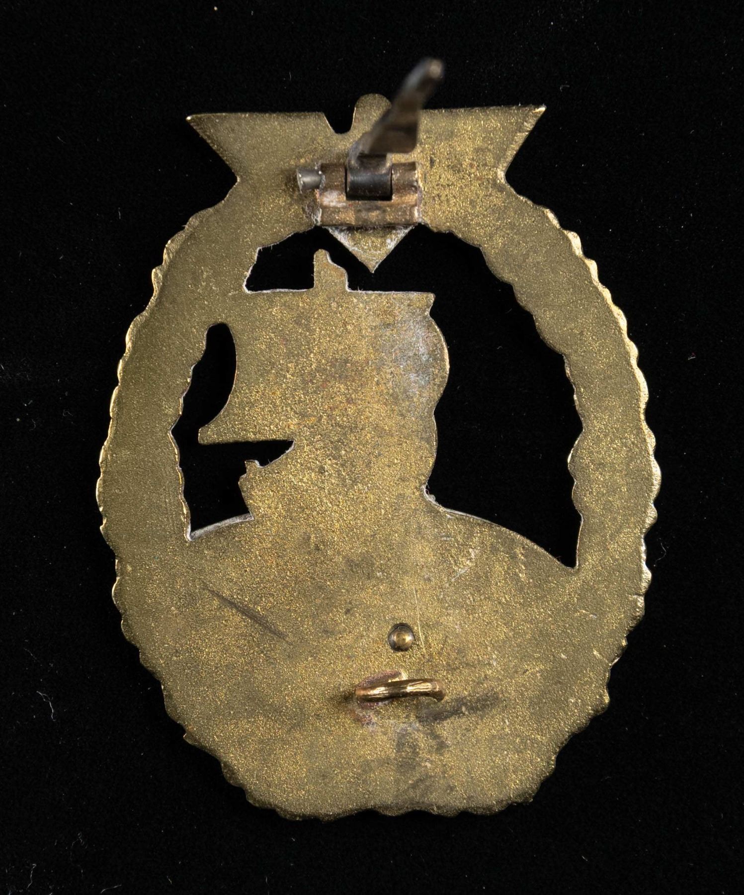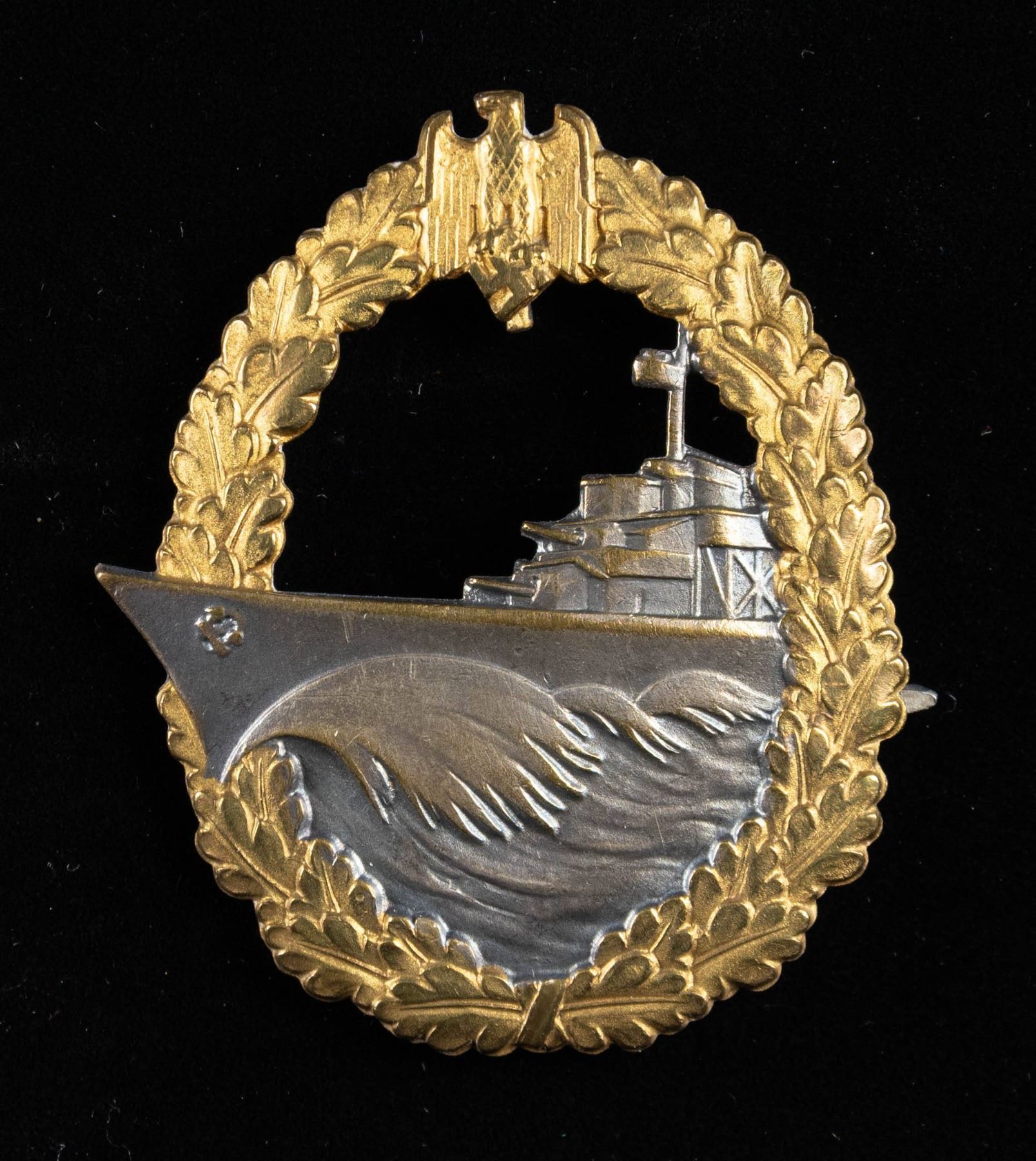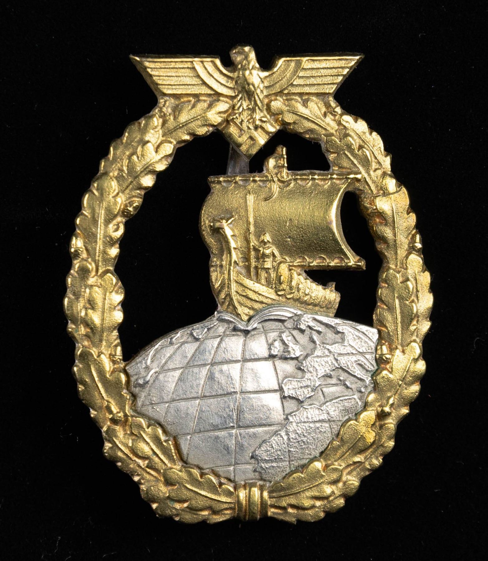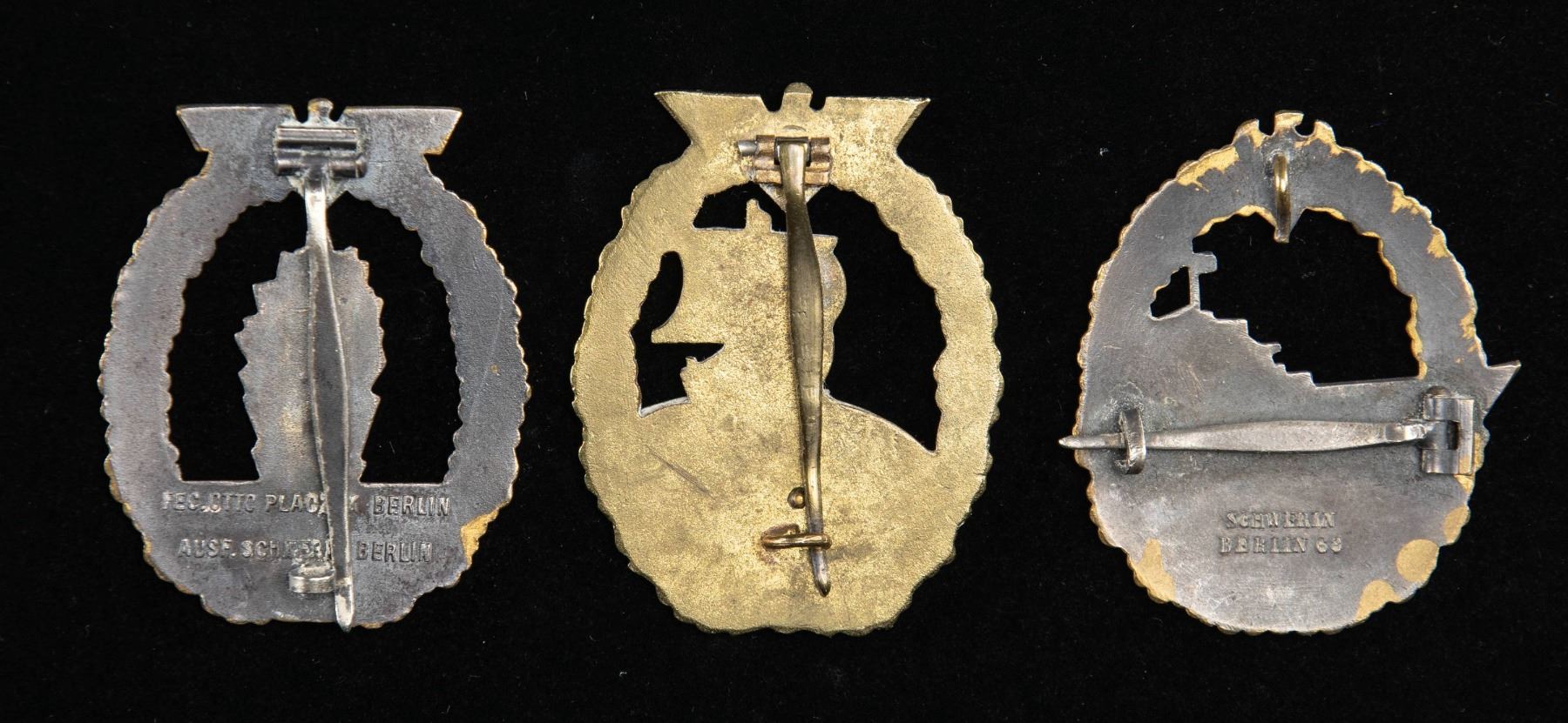 1) A fine example of an Minesweeper Badge with an eagle atop an oak leaf wreath surrounding a spray from an exploding mine. The reverse has a wide pin and is marked "FEC. OTTO PLACZEK BERLIN AUSF. SCHWERIN BERLIN". CONDITION: the face has nice gilding and the silver plating on the spray is a bit worn. 2) A nice Destroyer War Badge with an eagle atop an oak leaf wreath surrounding a fast moving destroyer. The reverse has a horizontal wide pin and is marked "SCHWERIN BERLIN 63". CONDITION: lots of gilding on the front with some wear to the boat's finish. 3) An interesting example of an Auxiliary Cruiser War Badge with an eagle atop an oak leaf wreath surrounding a globe & Viking ship. The reverse has a wide pin and shows a rivet that attaches the silver globe on the face to the rest of the badge. CONDITION: badge does show ample wear on the front as well as the reverse but the details remain striking. (02-25581-1/BF). NON-GUN. $800-1,200.