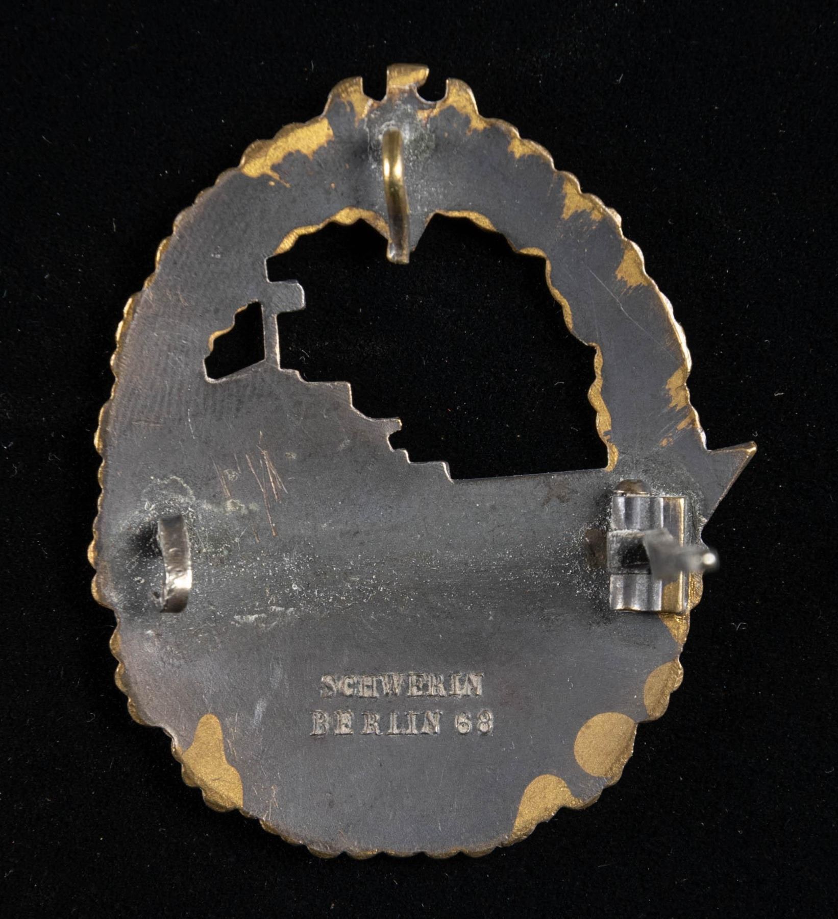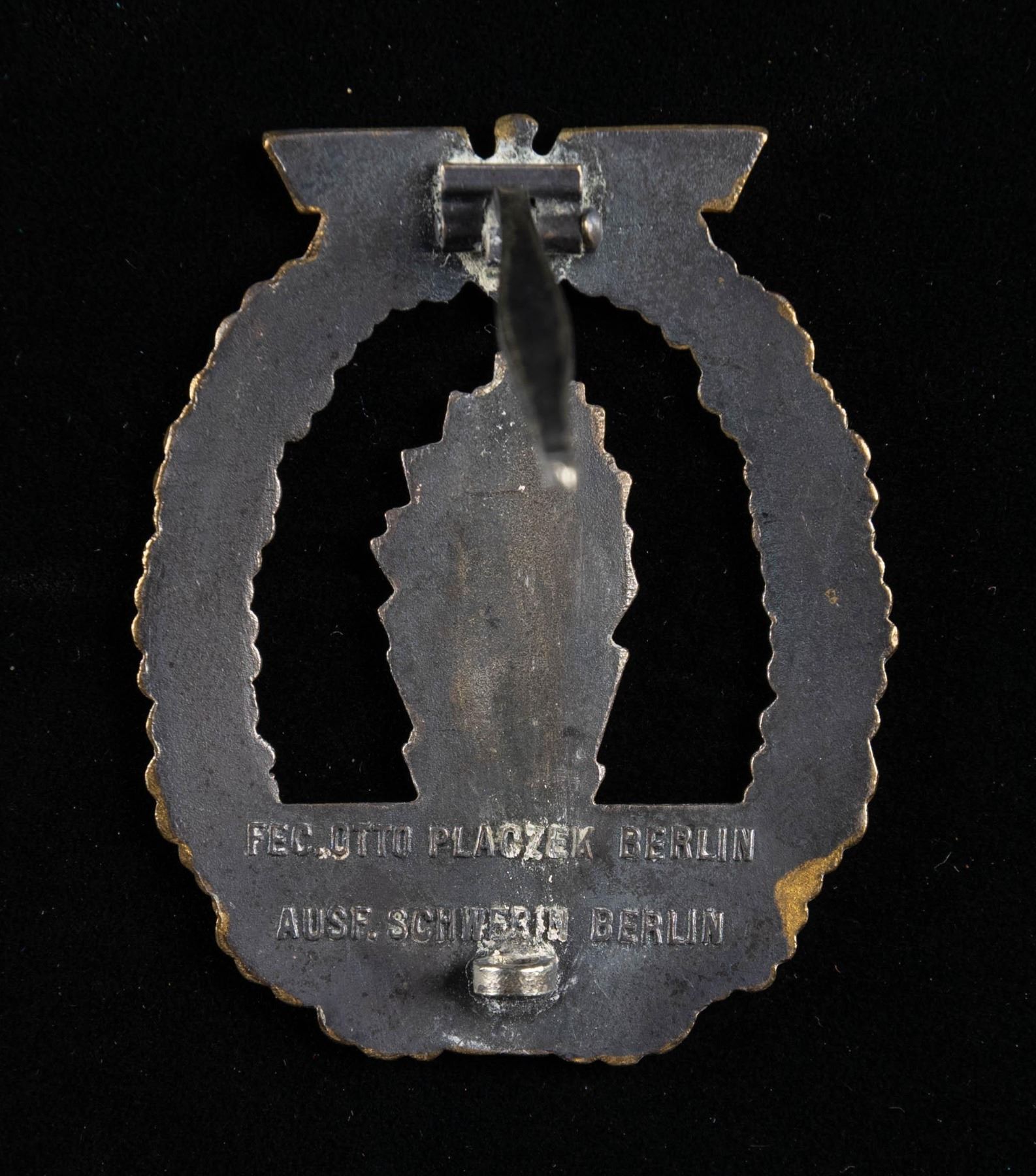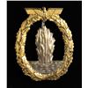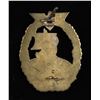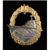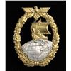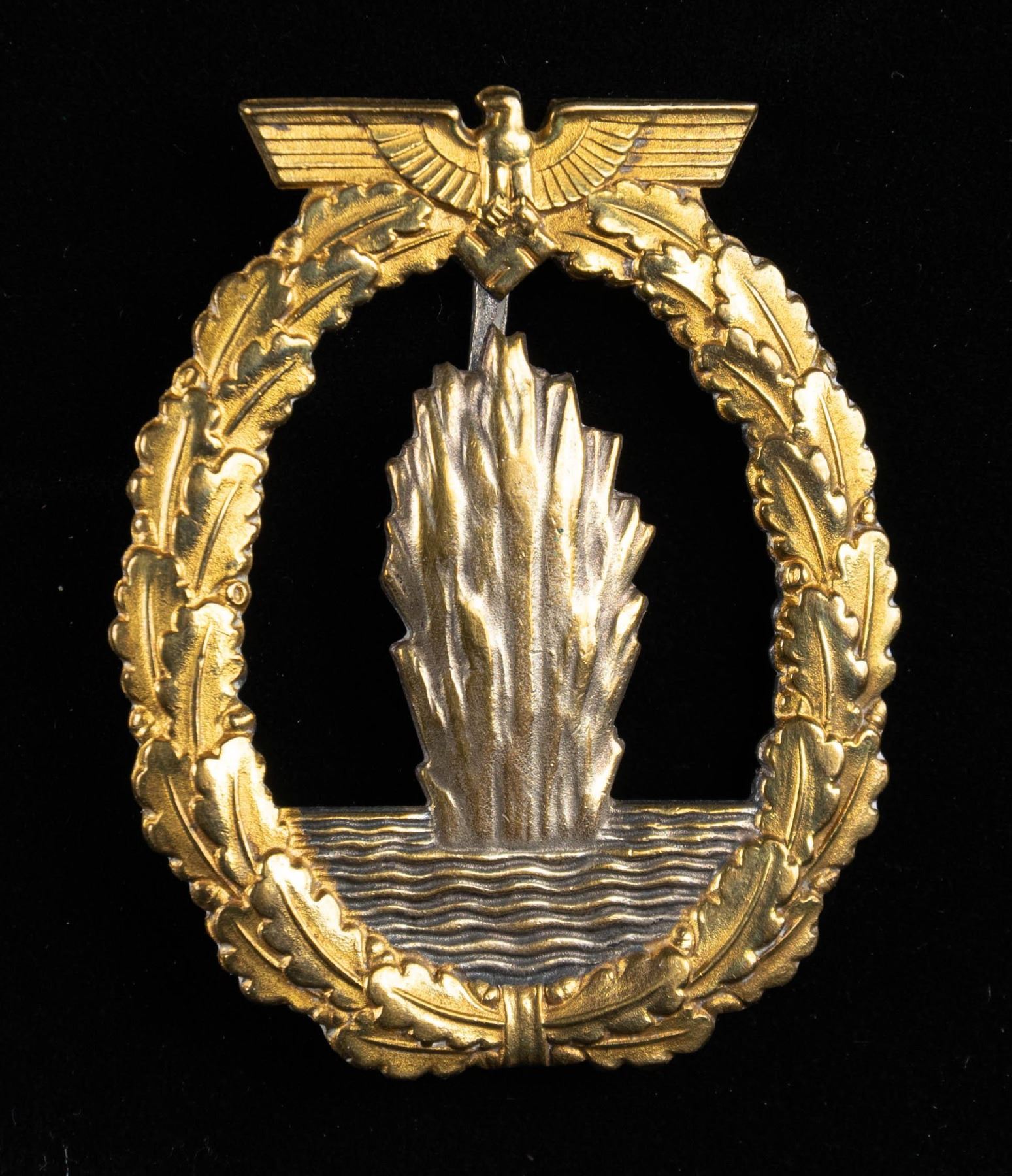 1) A fine example of an Minesweeper Badge with an eagle atop an oak leaf wreath surrounding a spray from an exploding mine. The reverse has a wide pin and is marked "FEC. OTTO PLACZEK BERLIN AUSF. SCHWERIN BERLIN". CONDITION: the face has nice gilding and the silver plating on the spray is a bit worn. 2) A nice Destroyer War Badge with an eagle atop an oak leaf wreath surrounding a fast moving destroyer. The reverse has a horizontal wide pin and is marked "SCHWERIN BERLIN 63". CONDITION: lots of gilding on the front with some wear to the boat's finish. 3) An interesting example of an Auxiliary Cruiser War Badge with an eagle atop an oak leaf wreath surrounding a globe & Viking ship. The reverse has a wide pin and shows a rivet that attaches the silver globe on the face to the rest of the badge. CONDITION: badge does show ample wear on the front as well as the reverse but the details remain striking. (02-25581-1/BF). NON-GUN. $800-1,200.