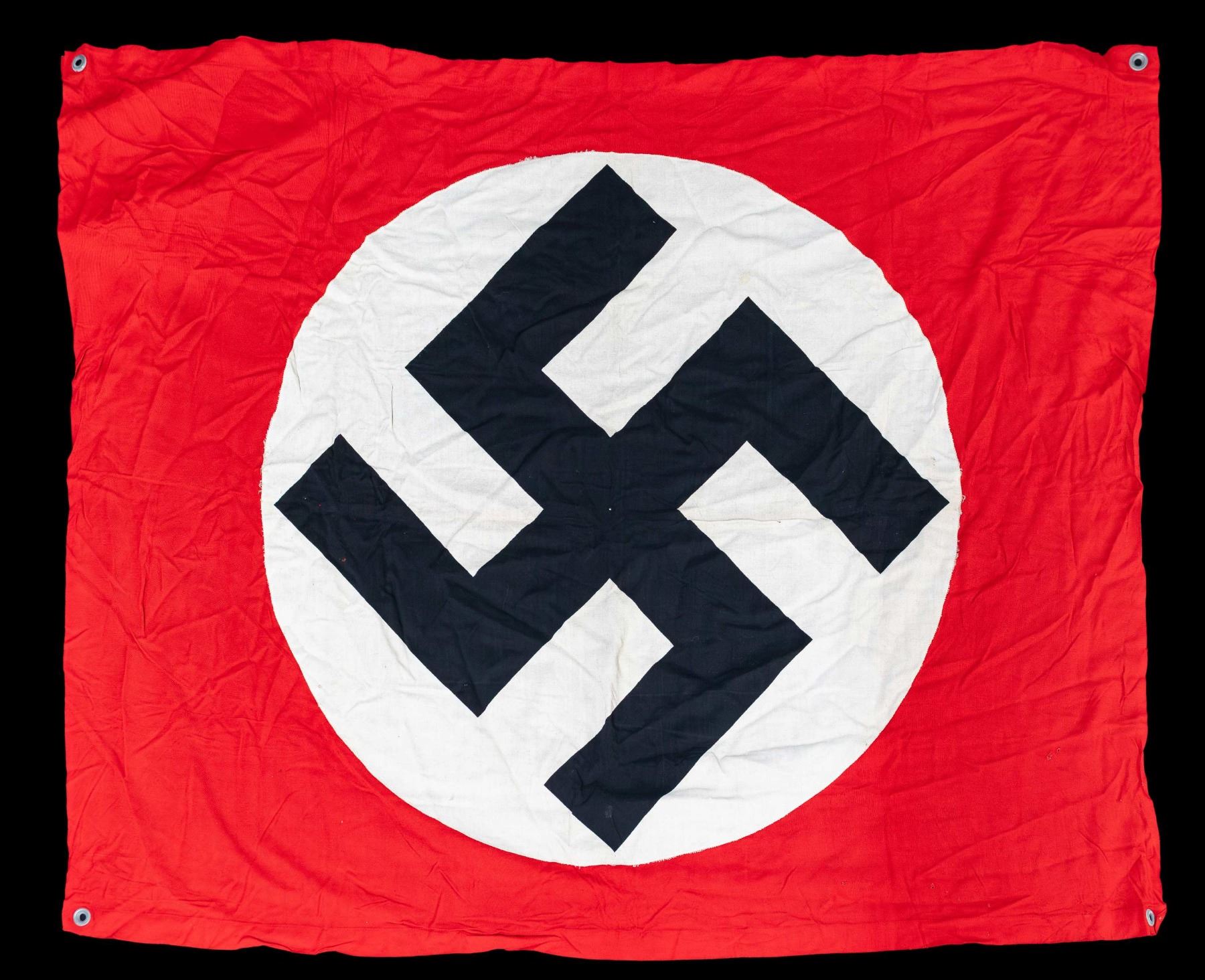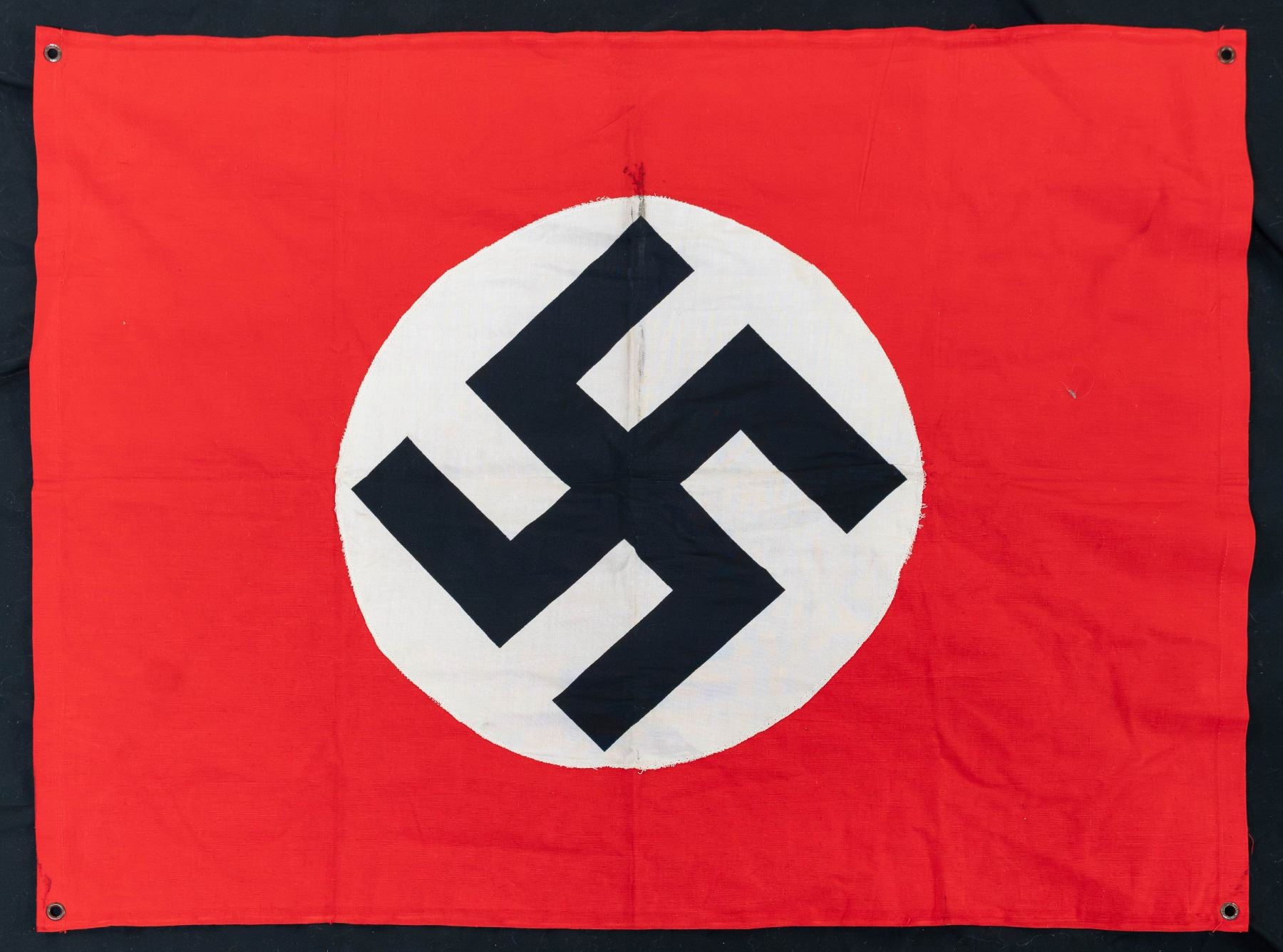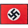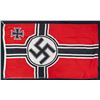 1) WWII German party flag or banner measuring about 42 1/2" x 35 1/2". The flag / banner is of standard form, style, and colors. CONDITION: light wear overall. 2) WWII German party flag or banner measuring about 37 3/4" x 28 1/4". The flag / banner is of standard form, style, and colors. CONDITION: light wear overall. 3) WWII German Kriegsmarine battle flag measuring about 95 1/2" x 55". The flag is of standard battle flag form, style, and colors and is marked on the hoist " (Kriegsmarine eagle) R.Kr.Fl. 150 X 250 G.A. Frohlichs Sohn A. G. Warnsdorf. Sud. ". CONDITION: light wear with a few small scattered stains or discoloration. (02-28179/BF). NON-GUN. $700-900.