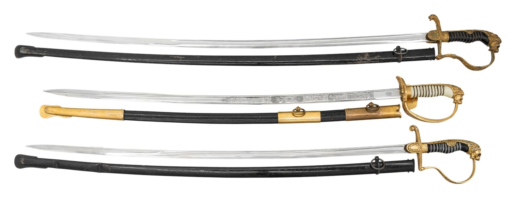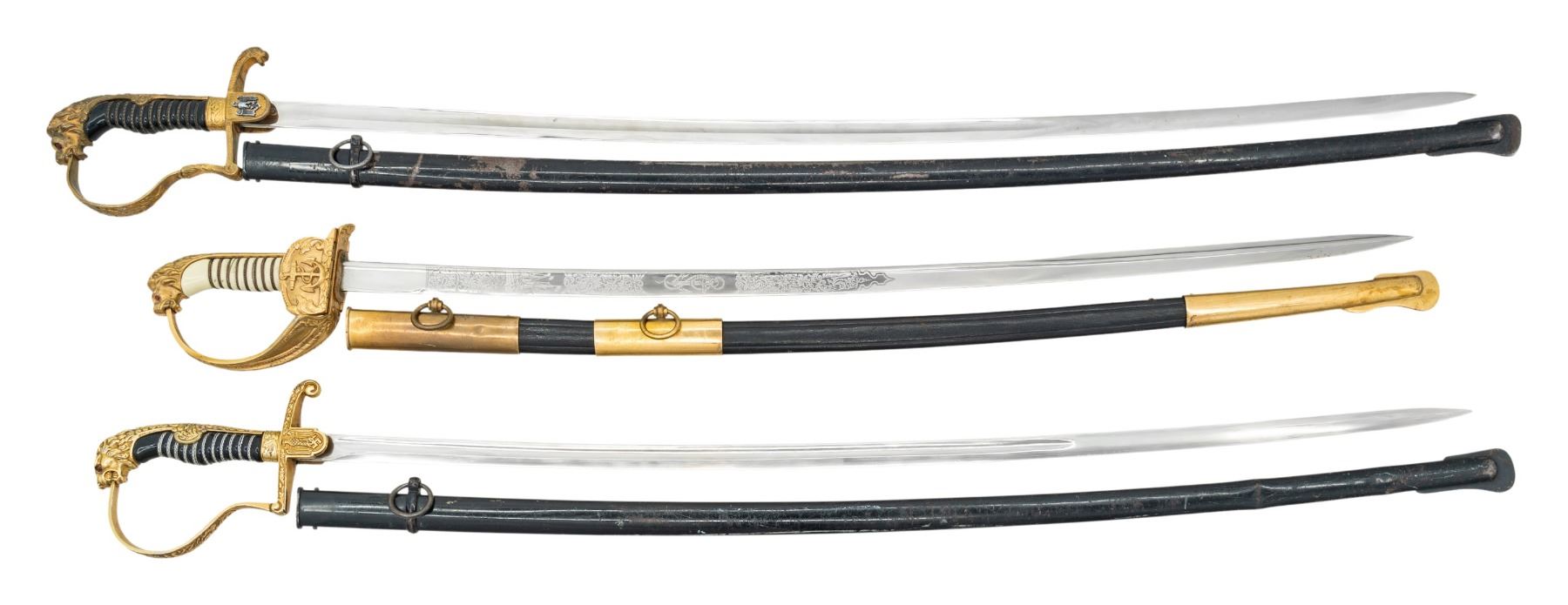 1) WWII German Army officer's sword measuring 39 1/2" overall with a plain blade marked "(logo) PUMA SOLINGEN". Gilded white metal hilt with reverse P guard and lion head pommel having "ruby" eyes. There is a droop wing eagle and Party symbol on the front langet. Wire wrapped black composite grip with a black enameled steel scabbard. CONDITION: blade has substantial original factory polish. Hilt shows light wear with 95% finish intact. Scabbard finish is about 80%. 2) WWII German Army officer's sword measuring 41 3/4" overall with a plain blade marked "(logo) WKC". Gilded brass hilt with reverse P guard and lion head pommel having "ruby" eyes. There is a silver droop wing eagle and Party symbol applied to front langet. Wire wrapped black composite grip with a black enameled steel scabbard. CONDITION: blade has substantial original factory polish. Hilt shows wear with 50% finish intact. Scabbard finish is about 75%. 3) WWII German Kreigsmarine officer's sword measuring 36" overall with a etched blade showing foliate and naval motifs. The blade is marked "E. & F. HORSTER (logo) SOLINGEN". Gilded brass hilt with folding anchor decorated guard and embellished knuckle bow. Well done lion head pommel with "ruby" eyes. Wire wrapped cream colored composite grip with gilded brass mounted black leather scabbard. CONDITION: blade has substantial original factory polish. Hilt shows very light wear with 99% finish intact but 1 "ruby" eye is missing. Scabbard is very sound with no breaks. (02-26151/BF). NON-GUN. $1,200-1,500.