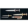 1) 2ND MODEL LUFTWAFFE. Overall length: 9 1/2". A good example of a miniature 2nd Model Luftwaffe dagger. Blade is marked, "D.R.G.M. (king) SMF SOLINGEN" and is unmarked on the reverse. Aluminum pommel and crossguard. Wire wrapped orange grip. Plated iron scabbard. CONDITION: blade has minor scattered staining. Remainder of dagger shows light overall wear.