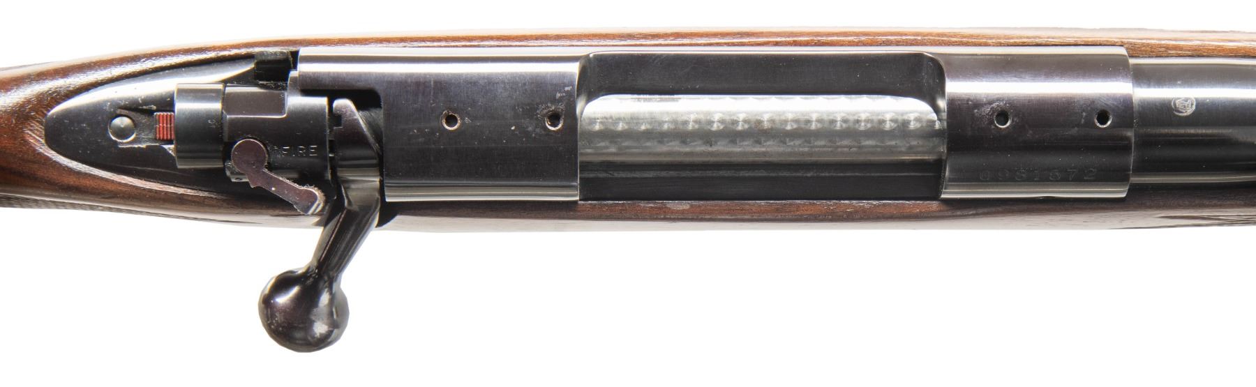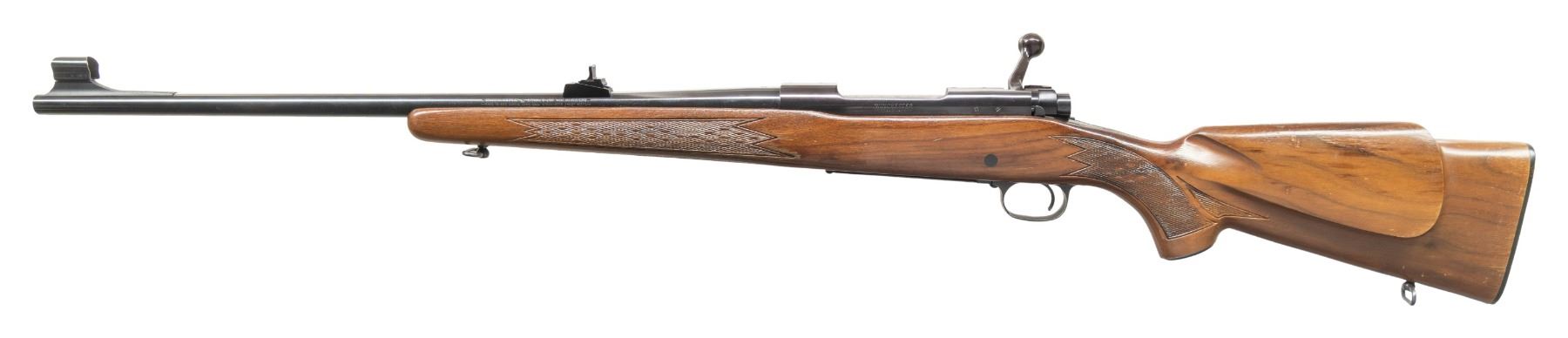 CAL. 30-06. S# G981572 (1970). Bbl. 22". Sporting iron sights. Push feed action w/ hinged floorplate, jeweled bolt & open holes for scope bases. Press checkered Monte Carlo walnut stock w/ sling swivels. CONDITION: very good blue. Good wood finish with wear & marks. Very good rifling with light fouling. PROVENANCE: From the PMRB Collection. (25-5960/MD). CURIO. $400-600.