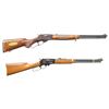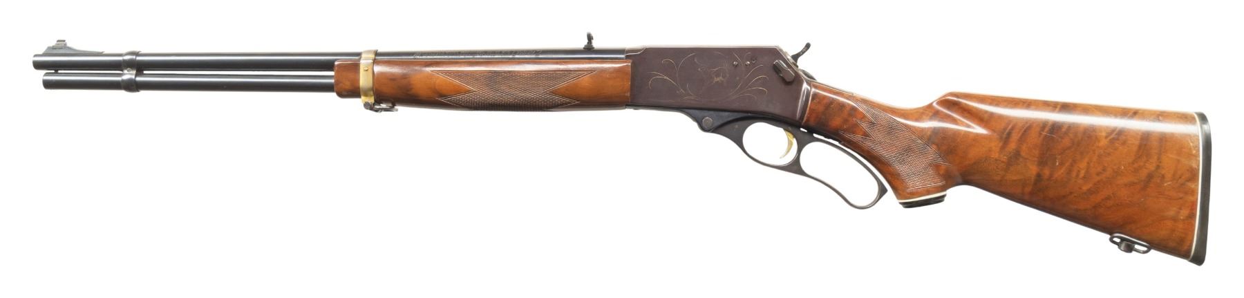 2) MOSSBERG 472 SBAS. S# S0363. Bbl. 18". Sporting sights. D&T engraved receiver w/ gold plated saddle ring. Tubular mag. Walnut stock set w/ gold plated parts. CONDITION: near excellent overall showing light handling marks & strong rifling. PROVENANCE: From the PMRB Collection. (25-5832/MD). ALL MODERN. $600-800.