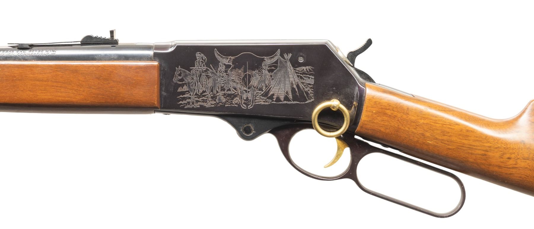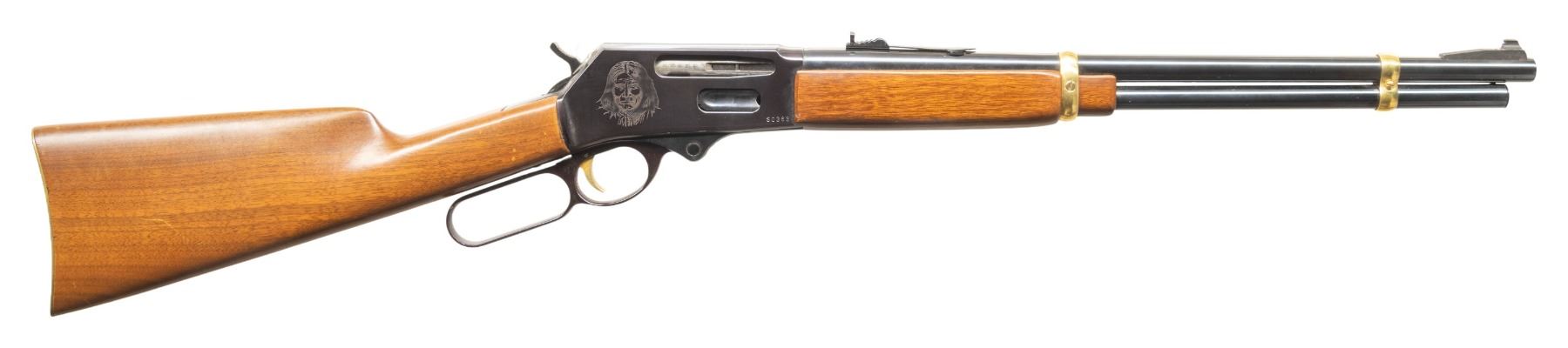 1) WESTERN FIELD MODEL 72 CENTURY 2. S# 0876. Bbl. 20". Sporting sights. Tubular mag. Walnut stock set w/ sling swivels, gold plated small parts & plaque on right side buttstock. CONDITION: very good overall appearance with handling mark & receiver having a plum hue. (25-5817/MD).