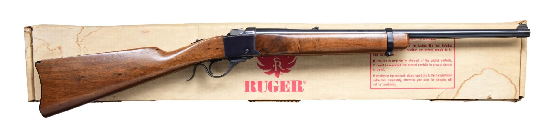 MATCHING BOX. Cal. 30-40 Krag. S# 130-63670 (1977). This Ruger No. 3 rifle features a blued finish. It has a 22-inch barrel with a standard bead front sight and an adjustable rear sight; D&T behind rear sight. The frame is blued with a smooth walnut stock set. The forearm is standard with barrel band. The buttstock is a straight grip design with a smooth finish and a Celcon buttplate. UNATTACHED ACCESSORIES: Factory box. CONDITION: Overall, this rifle is in near excellent condition. The barrel retains approximately 95% of its original finish. The frame retains about 95% of its finish having plum tone. The forearm and buttstock are in excellent condition with minimal handling marks. The bore is bright with strong rifling. MODERN (23-6456/MD) $500 - $700.