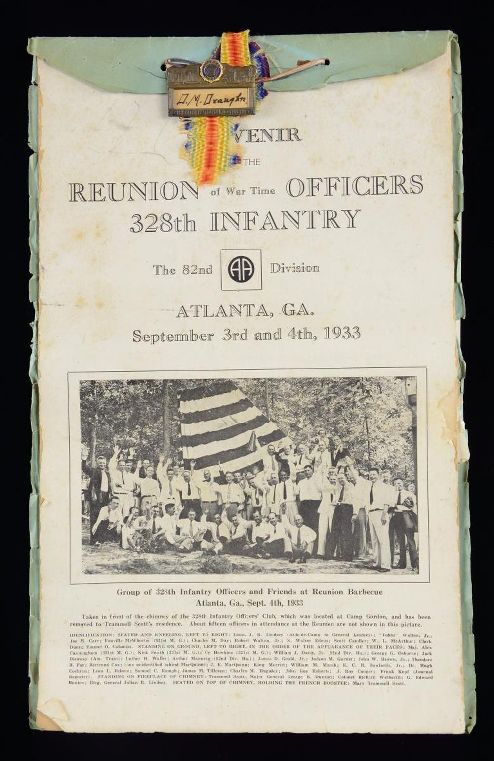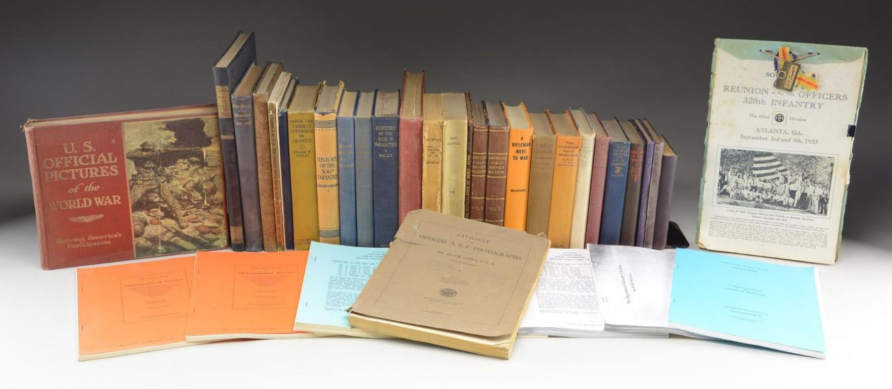 lot includes hardcover & paperback books. Lot includes, but not limited to: "History of the 18th U.S. Infantry First Division 1812- 1919". "The History of the United States Army Ambulance Service with the French and Italian armies" "The Medical Book of Merit" by Donald Macrae Jr. Volumes 1 & 2 of "American Field Service Bulletin". "Review of the American Forces in Germany" 1921. "Average Americans" by Theodore Roosevelt 1920 "WWI Campaign and Service Credits" by Planchett Press. "Citation Orders General Headquarters American Expeditionary Forces 1919-1920" 1982 by Albert Gleim. "The War Record of the University of Kansas June 1918". 2 Copies of the "Navy Book of Distinguished Service" 1984 Reprint by Planchet Press. "Decorations United States Army 1862-1926" by War Department 1927. "Catalogue of Official A. E. F. Photographs Taken by The Signal Corps U.S.A.". 1919. "History of the 308th Infantry" by L Wardlaw Miles 1927. "History of the 306th Infantry" 1935. 2 Copies of "The Second Division American Expeditionary Force in France 1917-1919" printed 1937. "Official Army Register January 1, 1930". "A Subaltern on the Somme in 1916" by Mark VII. "Let's Go Yank!" by Robert McGregor. "A Rifleman Went to War" by Herbert McBride 1935. "The Story of the United States Marines 1740-1919" by John W. Leonard. "Index to Recipient of the Navy Cross" by Charles McDowell. "Roster of the Rainbow Division (Forty-Second)" by Wm. A. Mann. "With The Yankee Division in France 1919" "Souvenir of the Reunion of War Time Officers 328th Infantry of the 82nd Division. in Atlanta, GA. September 3rd and 4th, 1933 including ribbon. CONDITION: books are fair overall showing stains & wear. A few examples having pages & cover detaching from binding. (02-19483-3/MD). $450-600.