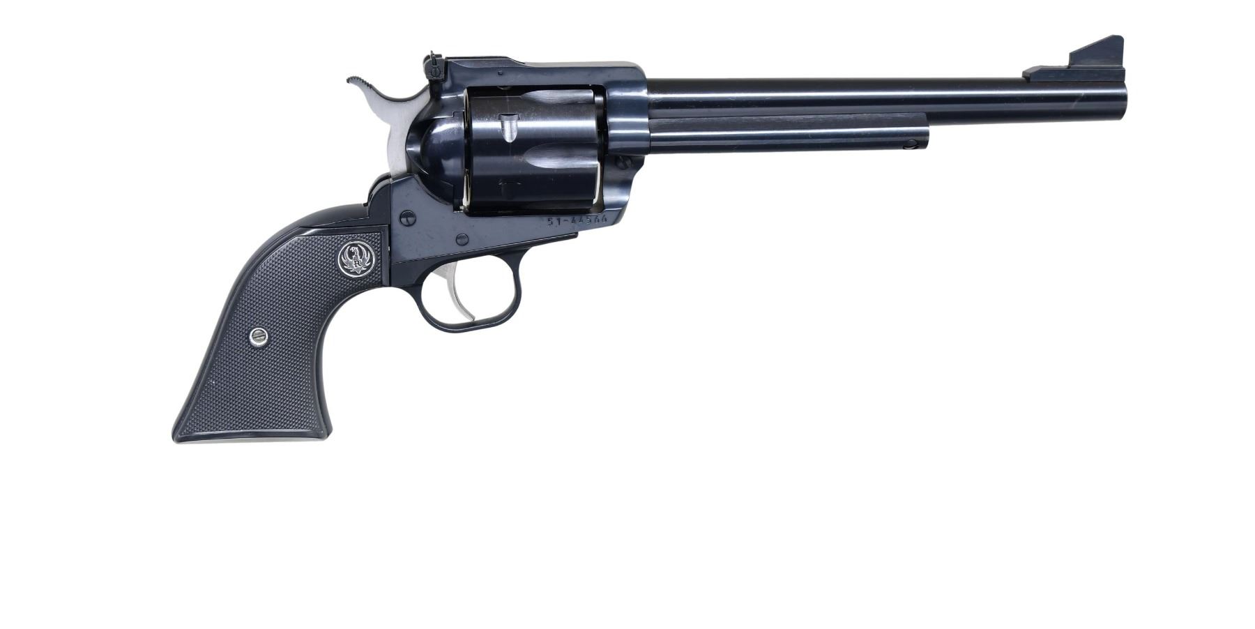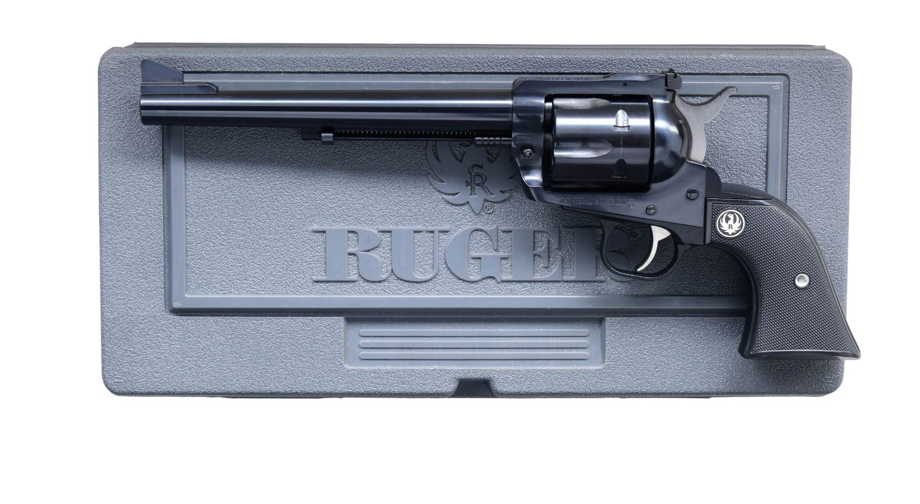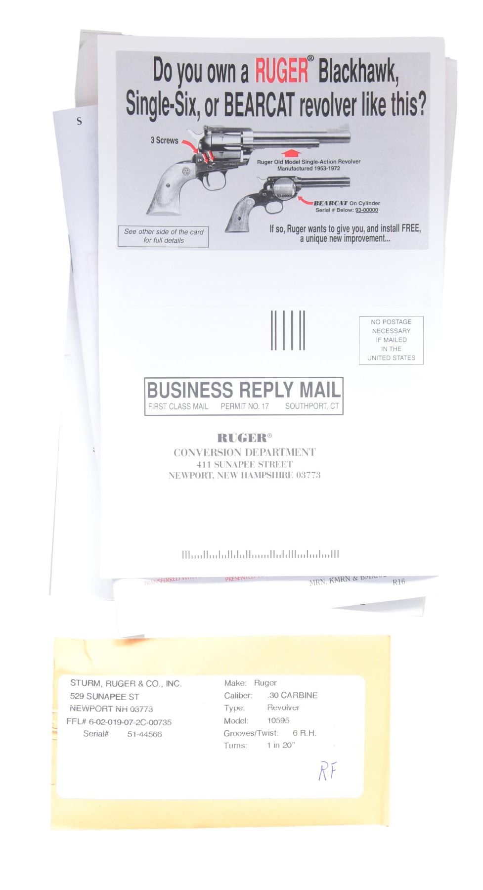 SA REVOLVER WITH MATCHING FACTORY BOX. CAL. 30 CARBINE S# 51-44566 (2012). Catalog No. BN-31L. This revolver features a blued finish. The barrel measures 7.5 inches, with a fixed front sight and an adjustable rear sight. The trigger is a standard single action with a hammer. The frame is a classic Ruger design with a fluted cylinder holding six rounds. The grips are checkered black polymer with a Ruger medallion. UNATTACHED ACCESSORIES: Factory box and instruction manual. CONDITION: The revolver is in near excellent overall condition with approximately 95% of the original finish remaining on the barrel and frame. The grips show minor wear but are in excellent condition. The bore is bright and sharp. MODERN (24-3459/MD) $500-$750.
