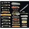 Includes 24 multi blade/ jack knives & 7 single blade knives. Makers include, but not limited to: Case, Remington, & Camillus. CONDITION: most in fair overall well worn & sharpened condition w/ varying degree of patina & oxidation. Some are missing blades. (02-17571/MD). $100-300.