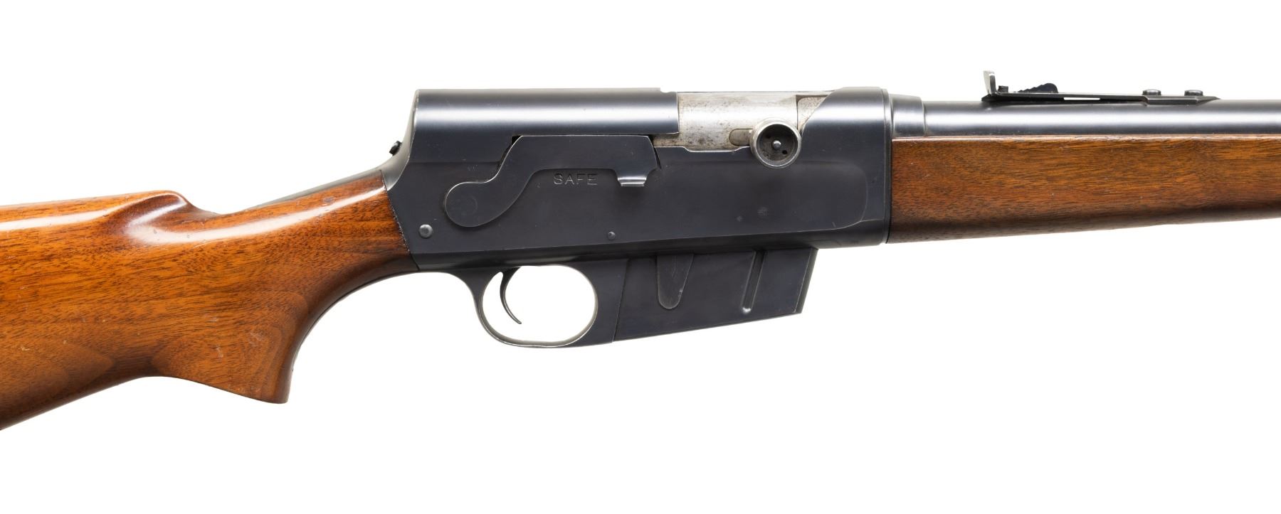 Cal. 300 Sav. S# 29068. Bbl. 23"; bbl. code "WRR" appears to indicate Aug. 1946 mfg. Barrel jacket has blade front sight & elevator rear sight. Action has replacement unmarked extractor & screw for receiver sight. Walnut stock set w/ checkered alloy buttplate. CONDITION: very good blue with handling marks & pinprick patina. Good wood finish with numerous handling marks & spots of peeling finish. Very good rifling. (25-6603/MD). CURIO. $400-600.
