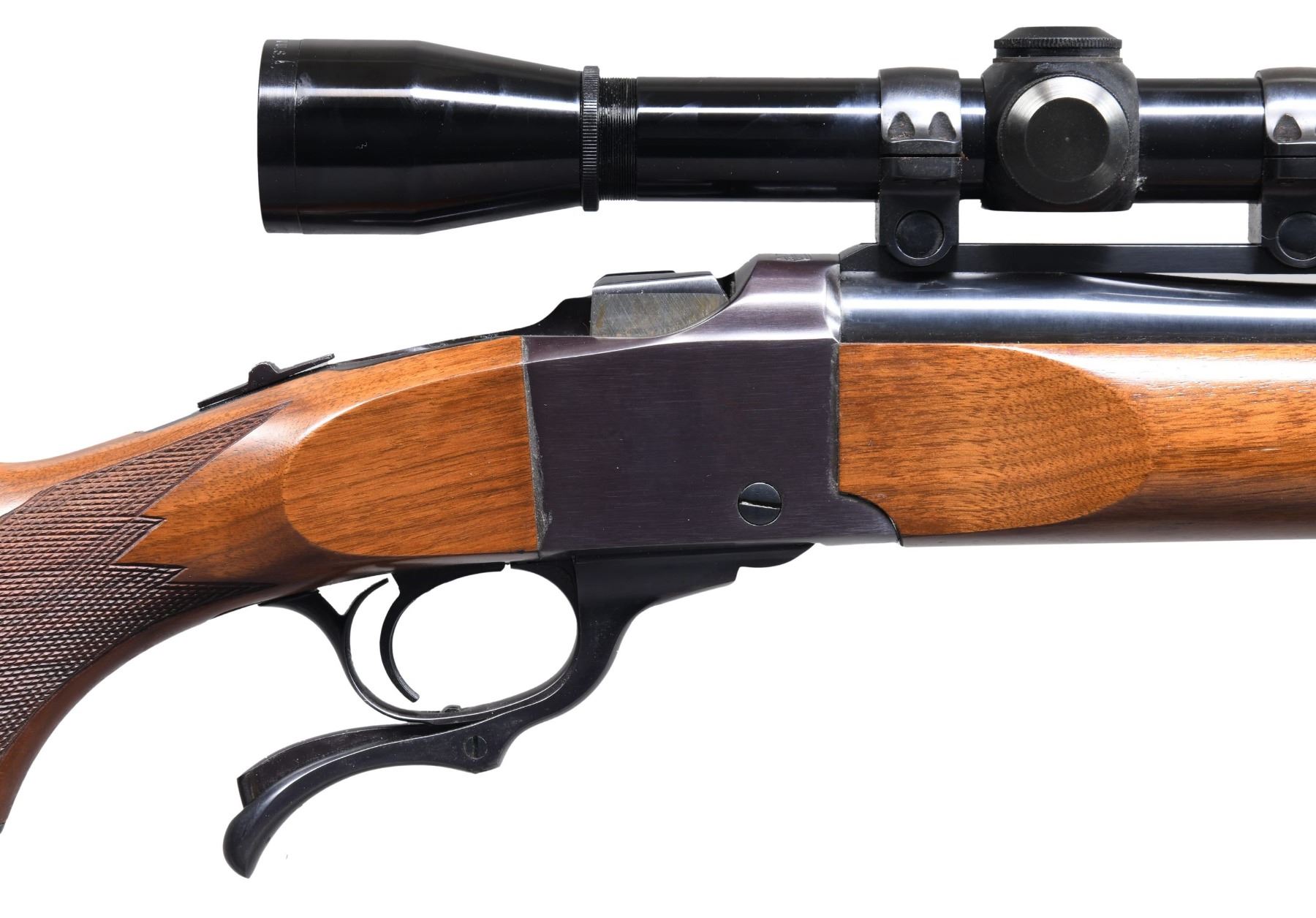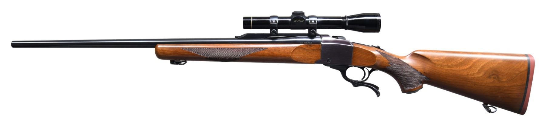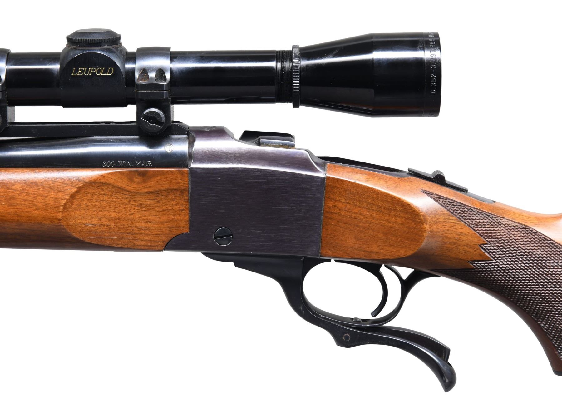 LEUPOLD SCOPE. Cal. 300 Win Mag. S# 131-22747. Mfg. 1978. Medium weight 26" bbl. w/ Warning marks & quarter rib. Leupold M8, 3x, crosshair scope on Ruger rings. Walnut beavertail checkered forearm with sling stud & swivel. Checkered walnut pistol grip buttstock w/ Ruger steel grip cap & red Ruger pad. CONDITION: original blue & wood finish have near excellent appearance w/ scattered minute handling marks; plum tone to receiver. Near excellent bore. Near excellent finish on scope w/ serviceable optics. PROVENANCE: Estate of Russell Dickerman. (25-1761/MD). MODERN. $1,000-1,500.
