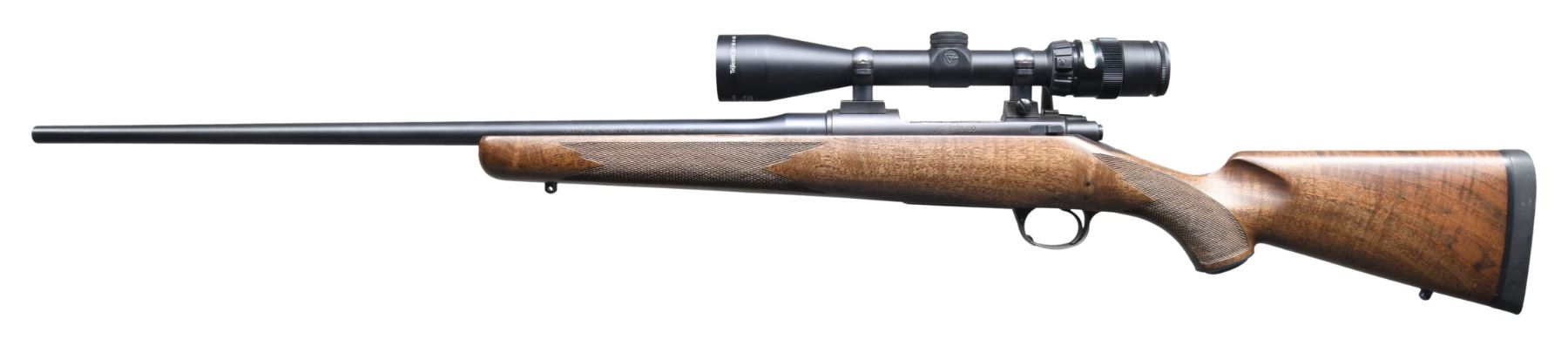 RIFLE WITH TRIJICON SCOPE. Cal. 300 WSM. S# KW01734. Sporter Match Grade 24" bbl. Trijicon 3-9x40 green Mil-dot reticle scope. Matte blued finish. Control feed action w/ matching numbered bolt, claw extractor, Model 70 style safety & match grade adj. trigger. A Grade checkered walnut stock w/ black pad. CONDITION: Wood finish around buttpad shows brown varnish applied over original finish; remaining balance of metal & wood finish is near excellent showing minor handling marks. Very good bore with scattered dark spots. Scope has near excellent finish w/ serviceable optics. (25-4051/MD). MODERN. $1,200-1,800.