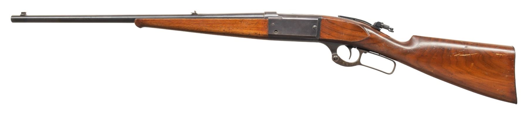 Cal. 303 Sav. S# 82.789 (Mfg. 1909). Bbl. 22". Replacement Lyman white bead front sight, folding leaf rear sight & modern Marble Arms tang folding peep sight. Rotary mag. action w/ sliding lever safety, cocking indicator & brass cartridge counter. Walnut stock set w/ Savage arms shotgun buttplate. CONDITION: metal has fair fading blue mixing with brown patina showing spots of oxidation, marks & deep cuts that appear to be from installing the barrel. Lightly sanded & refinished wood shows numerous light dings, spots of finish loss & scratches. Very good rifling with dark spots of lands.