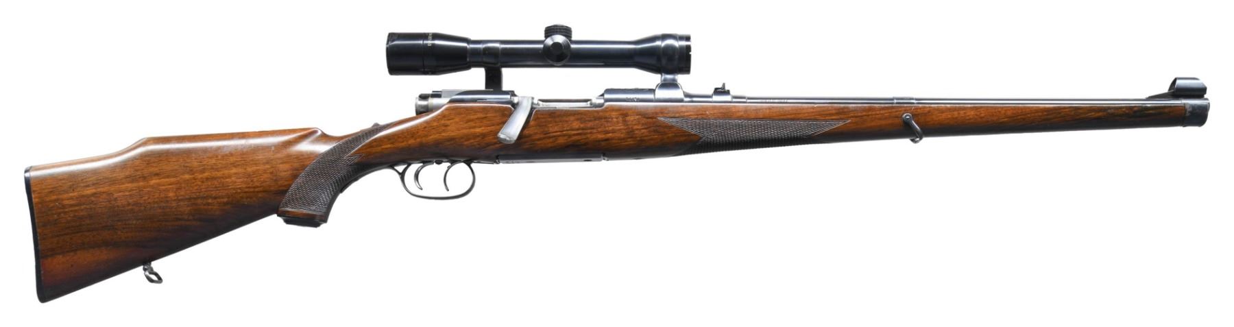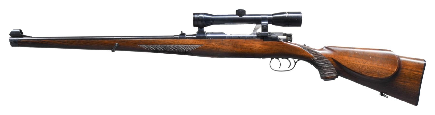 MCA BOLT ACTION CARBINE WITH KAHLES SCOPE & FACTORY CLAW MOUNTS. Cal. 308 Win. S# 54474. Mfg. 1966 & imported by Stoeger Arms Corp. Bbl. 20". Hooded bead front sight & 2 leaf rear sight. Kahles Hella-Super 4 S2, duplex reticle scope on offset claw scope rings & mounts. Dbl. set triggers. Plastic top tang safety. Mannlicher full length checkered walnut stock w/ steel nose cap, sling swivels, Monte Carlo cheekpiece, black plastic grip cap & buttplate. CONDITION: over 90% original blue finish with oxidation on nose cap & sling swivels, silvering in carry areas of triggerguard & mag. floorplate. Very good original wood finish with scattered marks that pierce the finish & peeling finish behind top tang. Very good shiny rifling. (25-4753/MD). CURIO. $1,200-1,800.