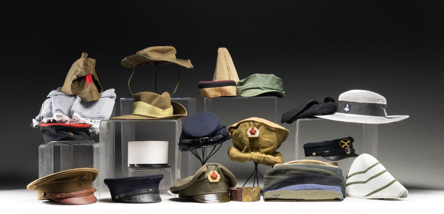 This varied lot contains 2 / reproduction American Civil War kepis, 1 / WWI US visor cap with improper insignia, 1 / Russian visor cap, 1 / Russian belt and buckle, 1 / Victorian era Canadian pill box style hat, 1 / red and black French kepi with an ordnance bomb on the front, 1 / US Waves straw uniform hat, 1 / Middle eastern head scarf, 1 / Tan Russian Afghani pakol, 1 / Black Afghani pakol, 1 / US OD fatigue cap, 1 / White French Foreign Legion kepi, 1 / Vietnam "boonie" hat, 1 / Turkish ceremonial hat, 1 / Nepalese hat, 1 / Russian Budenovka hat, 1 / Multinational Force Plaque, 1 / Australian Army hat, 1 US circa 1898 navy blue visor cap with no insignia, 11 / assorted, mostly US, overseas caps. CONDITION: most hats and caps show light use and none have significant damage. (02-25734/BF). NON-GUN. $600-1,200.