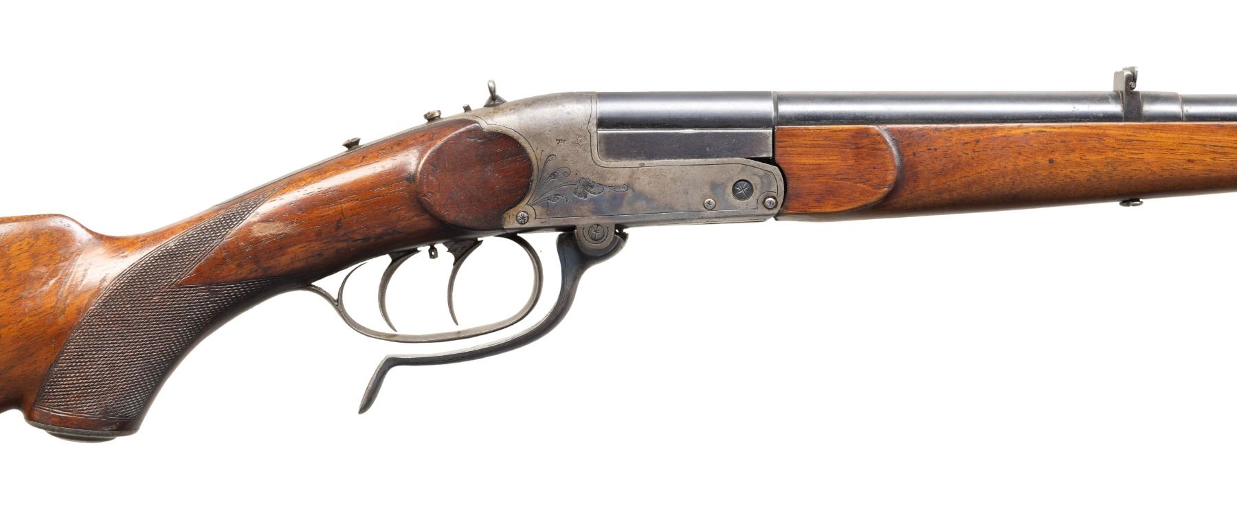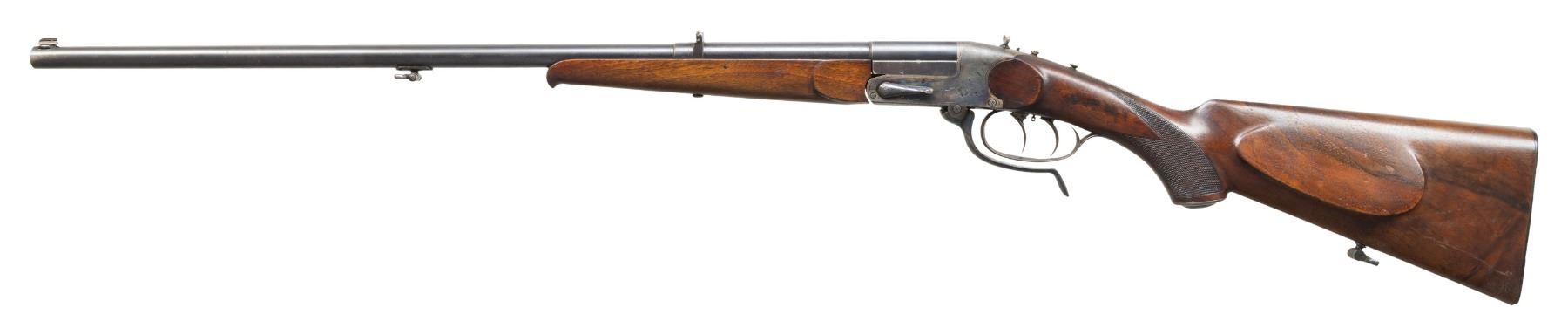 SHOT RIFLE. Cal. 32 Win (32-20). S# 210419. Bbl. 25.5". Blade front sight & 2 leaf rear sight. Underlever Tell action w/ dbl. set triggers, wing safety, cocking indicator & 2 screws for tang sight. Walnut stock set w/ schnabel forearm tip, Bavarian left side cheekpiece, checkered pistol grip, steel grip cap & horn buttplate. CONDITION: fair barrel blue mixed with peppery oxidation & scattered marks. Faded case colors on receiver with peppery oxidation & worn finish in carrying areas. Forearm lightly sanded & refinished showing a repaired crack on left side. Buttstock has worn wood finish with numerous light dings. Fair worn rifling. PROVENANCE: Estate of Groves Herrick. (25-5670/MD). CURIO. $500-800.