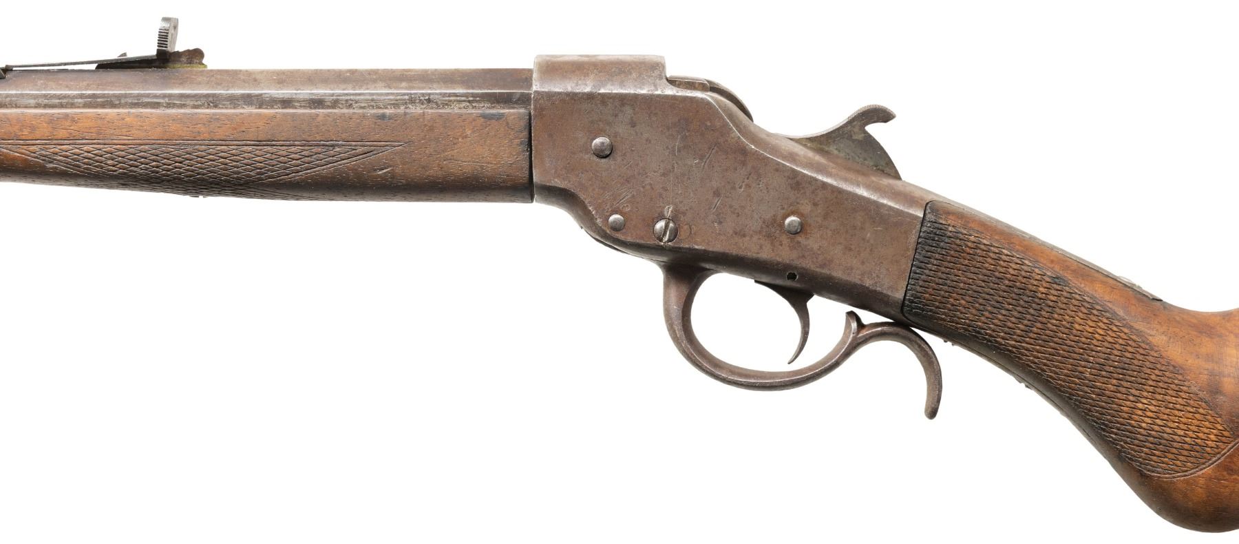 Cal. 32 WCF (32-20 WCF). S# 9849 (on action face under forearm). Oct. 26" bbl. German silver blade front sight & elevator rear sight. Falling block action. Checkered walnut stock set w/ hard rubber buttplate. CONDITION: metal has brown/gray patina appearance with deep marks, scratches, corrosion & pitting throughout. Lightly sanded & refinished wood with re-cut checkering, sm. dings & sm. gaps to action. Good rifling with light pitting. PROVENANCE: Estate of Groves Herrick. (01-28367/MD). ANTIQUE. $300-400.