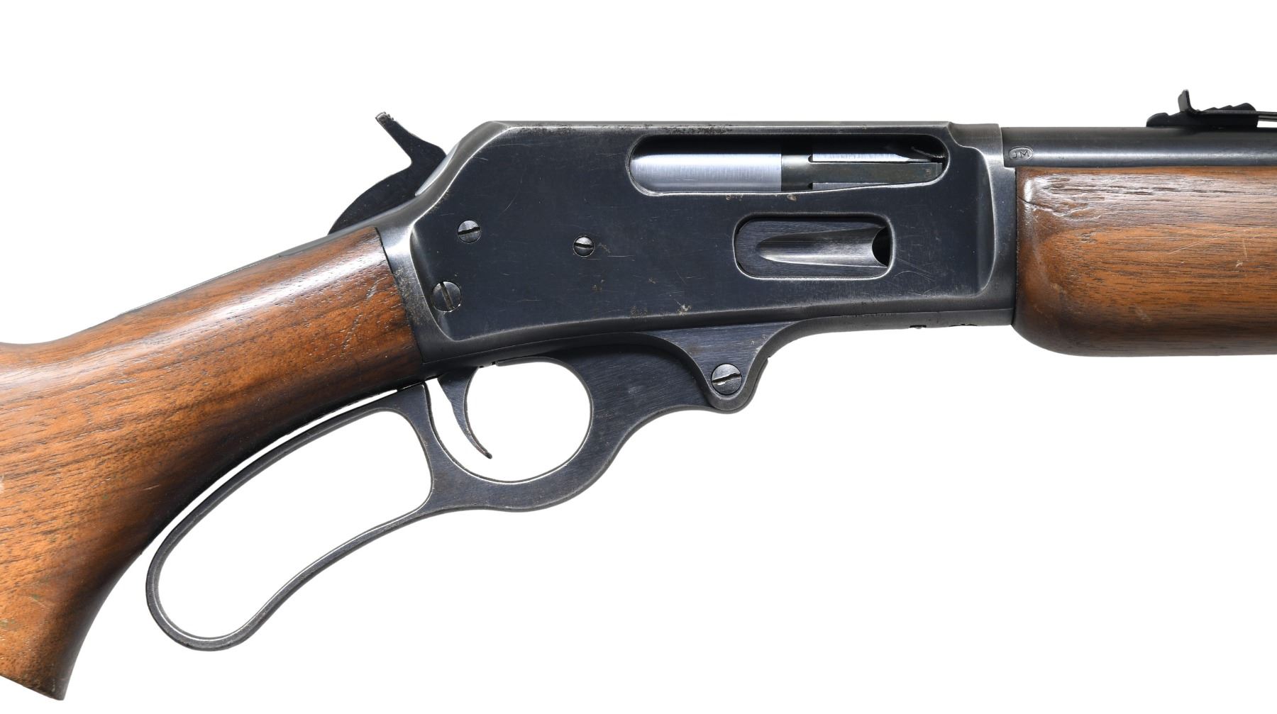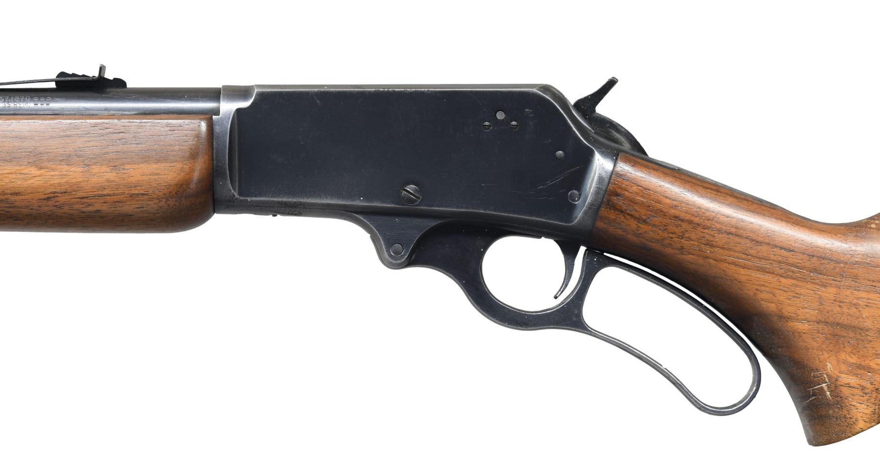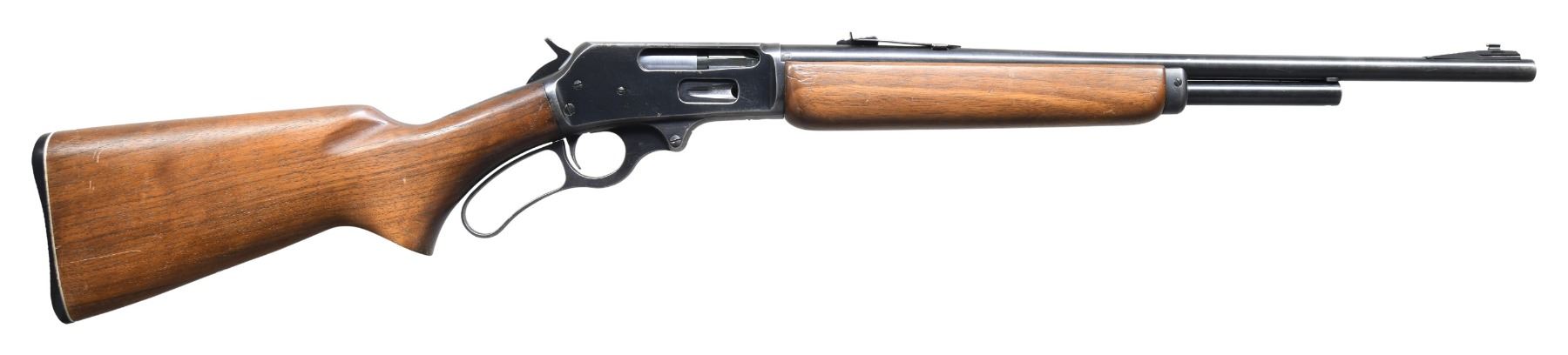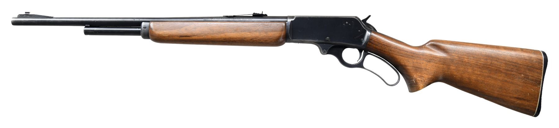 CARBINE. Cal. 35 Rem. S# H56443. Bbl. 20" round. Ramp mounted bead front sight w/ sporting rear sight. 2/3rds length tubular mag. Receiver has matted top. Semi-beavertail forearm & pistol grip walnut stock w/ plastic buttplate & white line spacer. Mfg. 1948-1963. CONDITION: 80% lightly worn blue showing carry wear. Stock finish shows light wear w/ scattered scratches & marks. Very good bore. (24-2867/DS). CURIO. $500-700.