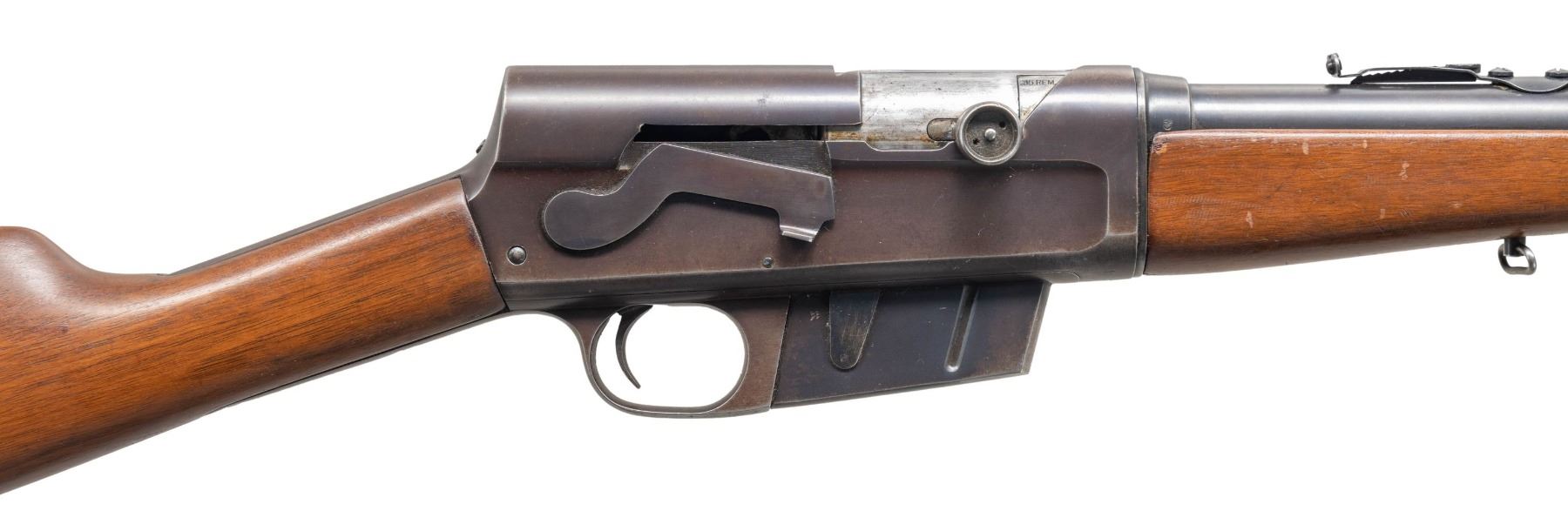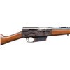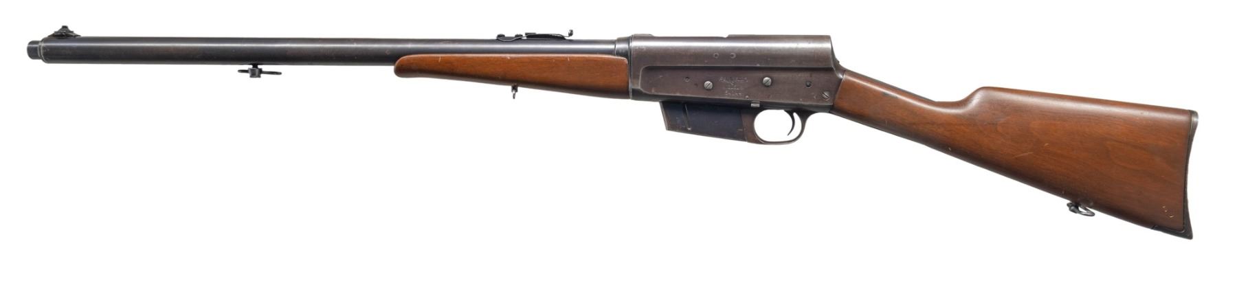 Cal. 35 Rem. S# 54144. Bbl. 22". Barrel jacket has sling swivel & sporting sights; rear sight missing elevator. Extractor appears to be correct, but number partially stamped. Walnut stock set w/ sling swivel & crescent grooved buttplate. CONDITION: barrel has fair worn blue finish mixing with brown patina. Balance of action has brown patina appearance with traces of blue on mag. body. Sanded & refinished wood shows handling marks. Good strong rifling with light pitting. (25-4439/MD). CURIO. $500-800.