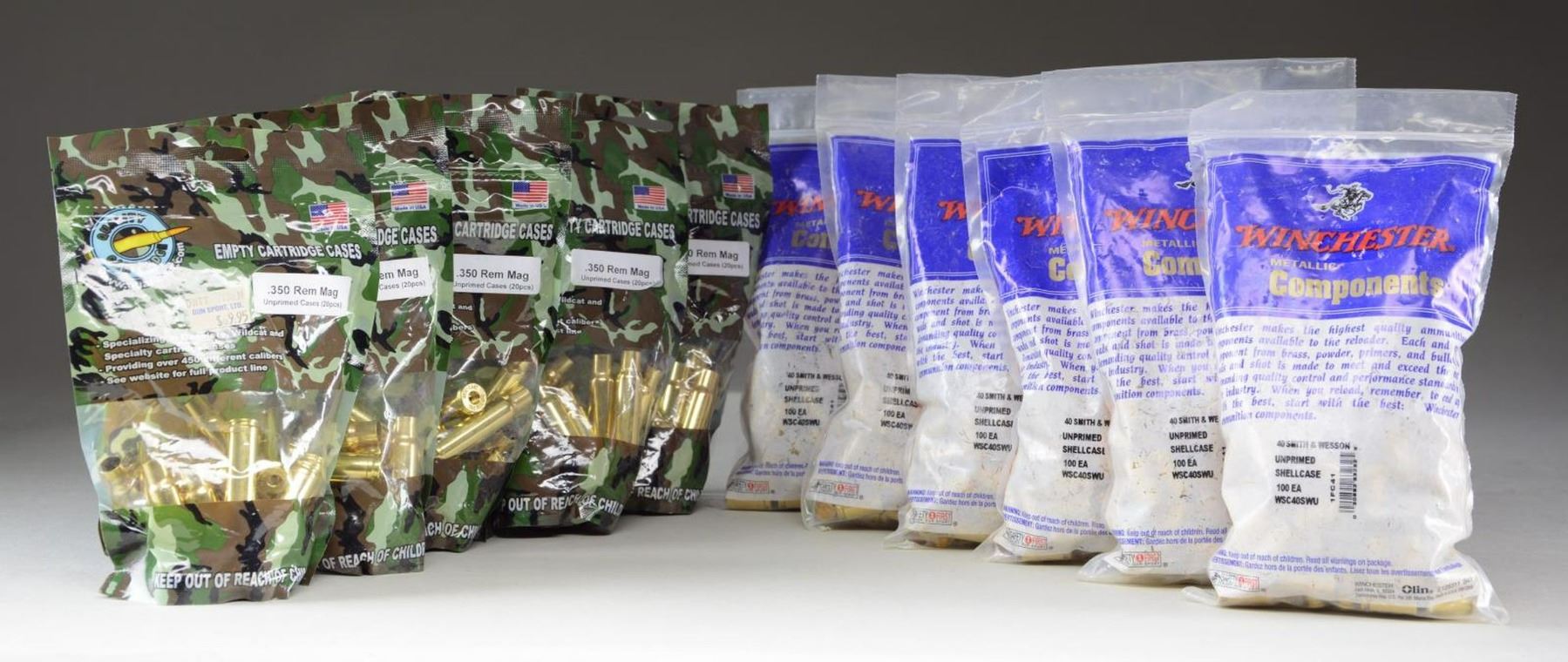 Lot includes the following; 100 rds. Quality Cartridge 350 Rem. Mag. unprimed cases & 600 rds. Winchester 40 S&W unprimed cases. CONDITION: All are in sealed factory packaging, as new. PROVENANCE: The Collection of Gun Sport Ltd owned by Jon R. Thomas. (02-20854-6/JZ) $300-400.