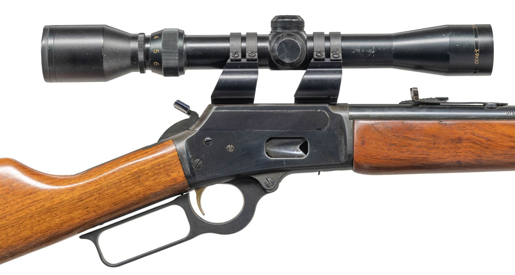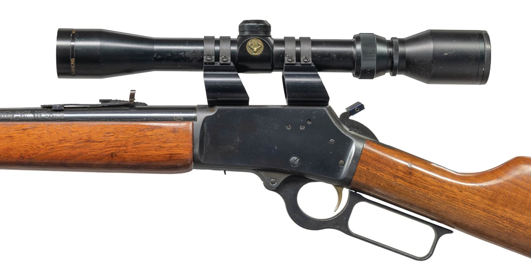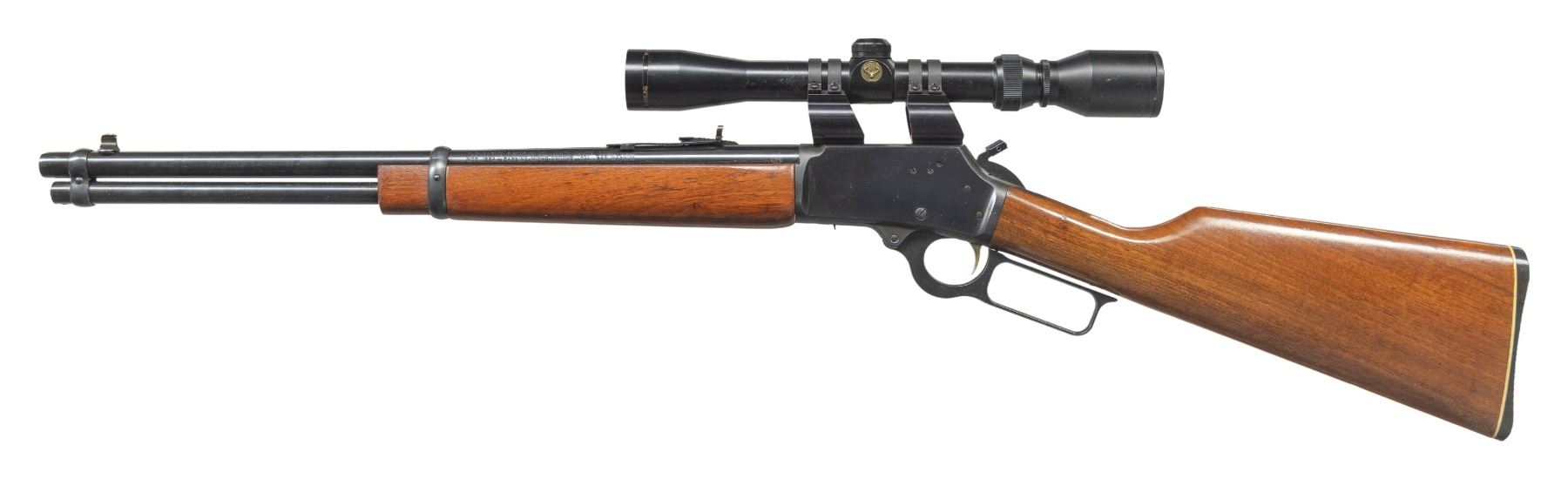 Cal. 357 Mag. S# 19082187. Mfg. 1981. Bbl. Sporting sights. Simmons Whitetail 3-9x32 duplex scope on see through rings. Tubular mag. Hammer extension. Gold washed trigger. Walnut stock set. CONDITION: very near excellent blue. Very good lightly refinished wood w/ light handling wear. Very good rifling with residue in grooves near muzzle. (25-4829/MD). MODERN. $500-800.