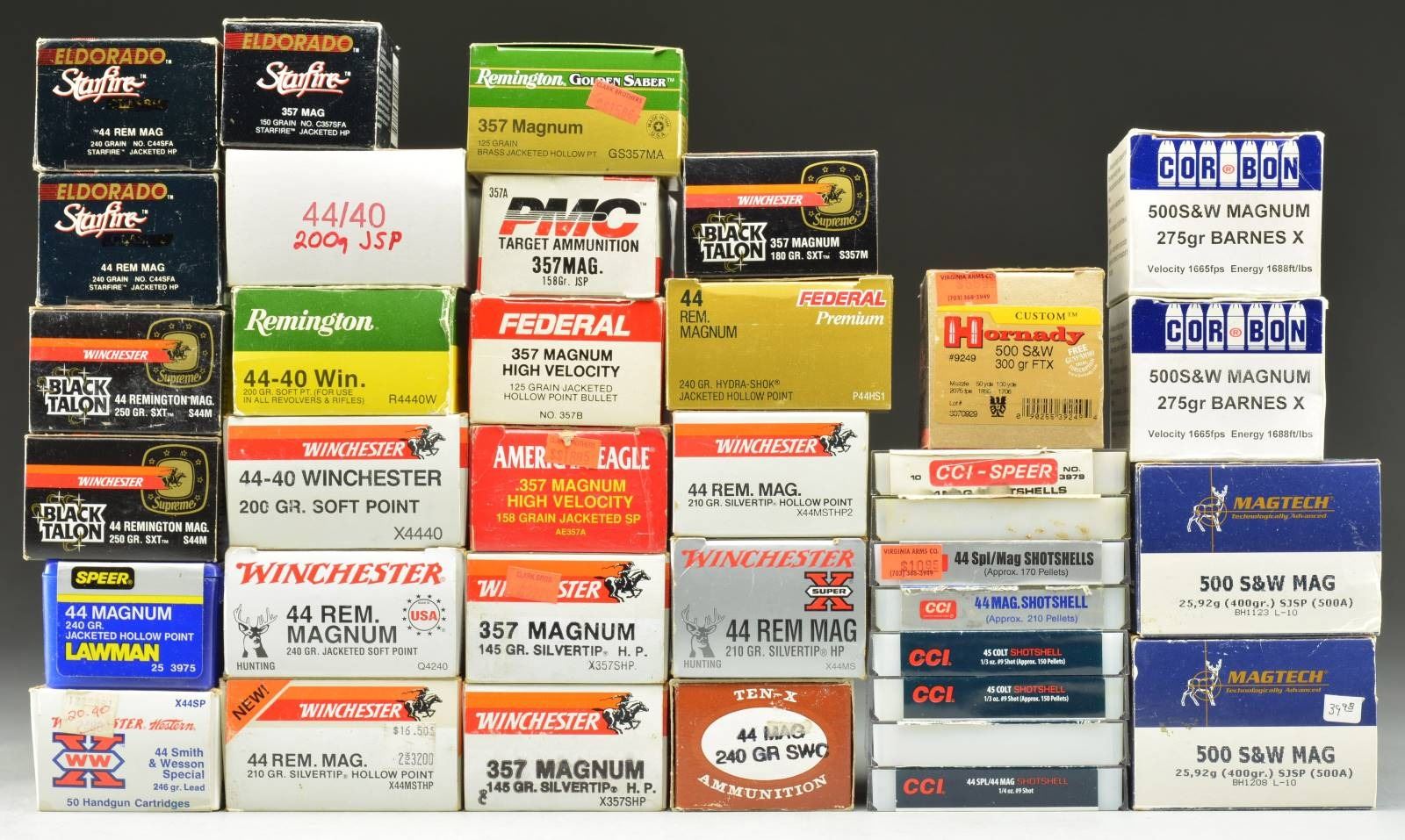 357 MAGNUM: 1 box 50 rds. American Eagle 158 gr. JSP. / 1 box 50 rds. Federal 125 gr. JHP. / 1 box 44 rds. PMC Target 158 gr. JSP. / 2 boxes 71 rds. Winchester 145 gr. Silvertip HP plus 29 rds. CCI Blazer JHP. / 1 box 25 rds, Remington Golden Saber 125 gr. JHP. / 1 box 20 rds, Winchester Black Talon 189 gr, SXT. / 1 box 20 rds. PMC Eldorado Starfire 150 gr. JHP. \ 44-40 WINCHESTER: 1 box 50 rds. Precision Components & Guns 200 gr. JSP. / 1 box 50 Remington 200 gr. JSP. / 1 box 50 rds. Winchester 200 gr. JSP. / 44 S&W SPECIAL: 1 box 50 rds. Winchester 246 gr. Lead. / 44 REM. MAG.: 1 box 50 rds. Winchester 210 gr. Silvertip HP. / 2 box 40 rds. Winchester 210 gr. Silvertip HP. / 1 box 50 rds. Winchester 240 gr. JSP. / 1 box 25 rds. Ten-X 240 gr. Lead SWC. / 1 box 25 rds. Speer Lawman 240 gr. JHP. / 1 box 20 rds. Federal Premium 240 gr. JHP. / 2 boxes 40 rds. Winchester Black Talon 250 gr. SXT. / 2 boxes 40 rds. PMC Eldorado Starfire 240 gr. JHP. / 2 packs 20 rds. CCI 44 Spl./Mag. Shotshells. / 3 packs 30 rds. CCI 44 Mag. Shotshells. / 45 LONG COLT: 3 packs 24 rds. CCI Shotshells. / 500 S & W MAGNUM: 1 box 20 rds. Hornady 300 gr. FTX. / 2 boxes 23 rds. Magtech 400 gr. SJSP. / 2 boxes 24 rds. Cor-Bon 275 gr. Barnes X. CONDITION: all excellent. (02-17081-5/NW). $350-500.